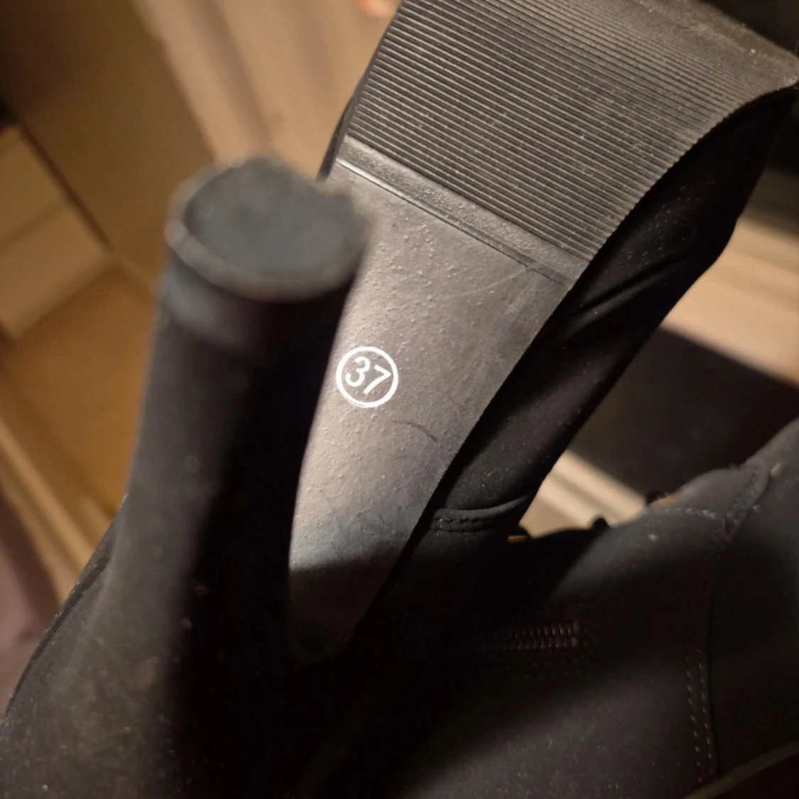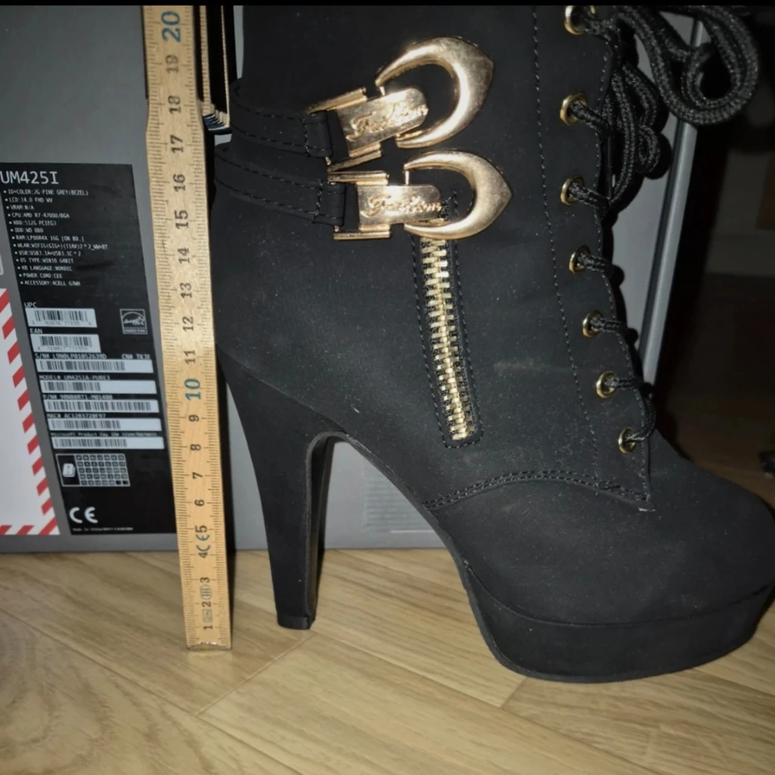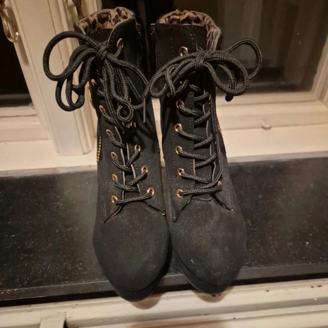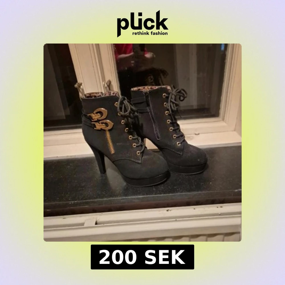 Säljer ett par svarta boots med hög klack från SHEIN. Skorna har snörning framtill, guldfärgade detaljer och dragkedja på sidan. Insidan är fodrad med leopardmönster. Storlek 37, 10cm hög klack (se bild för egen referens) Provade inomhus aldrig använda utomhus. Mycket fina i mocka imitation. Nypris: 349kr #klackskor #klackskor37 #skor37 #wilmabooksskor37
