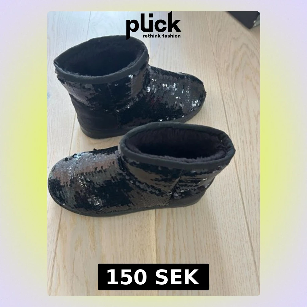 Glittriga svarta boots med paljetter över hela skon. De har en rund tå och platt sula, samt ett mjukt och varmt foder på insidan.