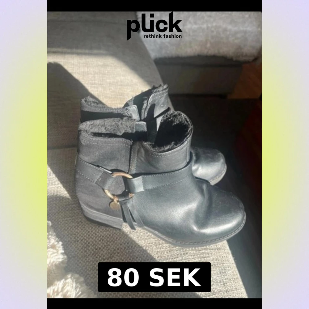 Snygga svarta boots med rund tå och platt sula, fodrade med mjuk päls på insidan. Skorna har en dekorativ guldring på sidan och dragkedja för enkel på- och avtagning. Materialet är skinn och mocka, perfekt för kyliga dagar.