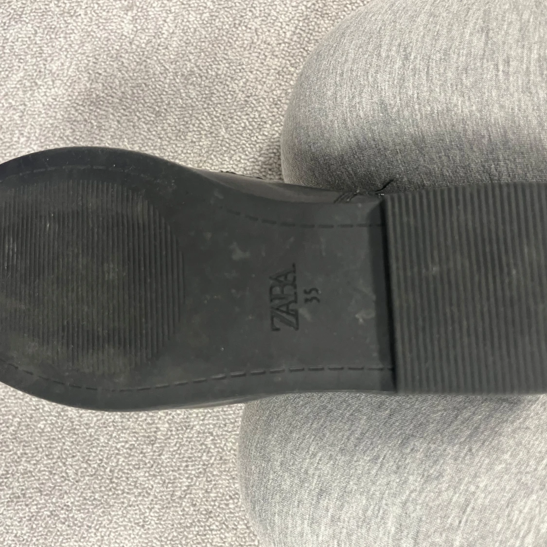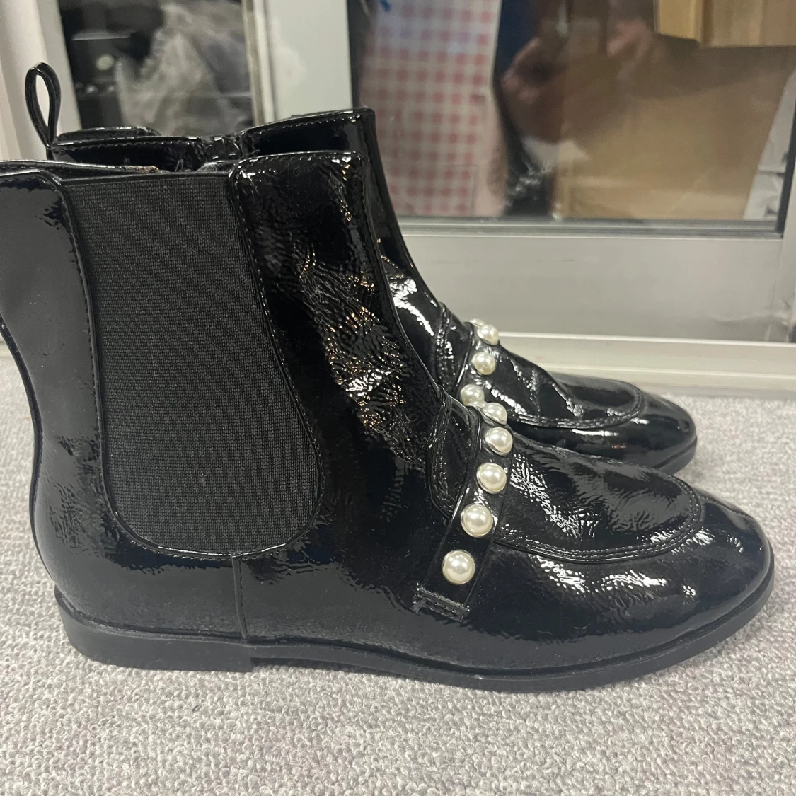 Snygga svarta boots i lack från Zara med pärldetaljer över foten. De har en dragkedja på sidan för enkel på- och avtagning. Perfekta för att ge en elegant touch till din outfit.