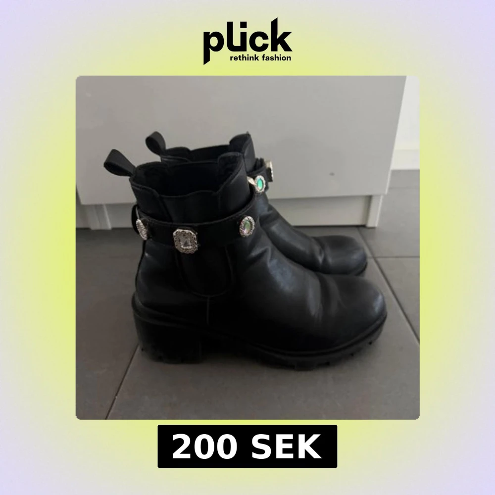 Snygga svarta boots i skinn med chunky klack och rund tå. Har tappat en diamant grej på vänstra men det syns knappt! Storlek 39