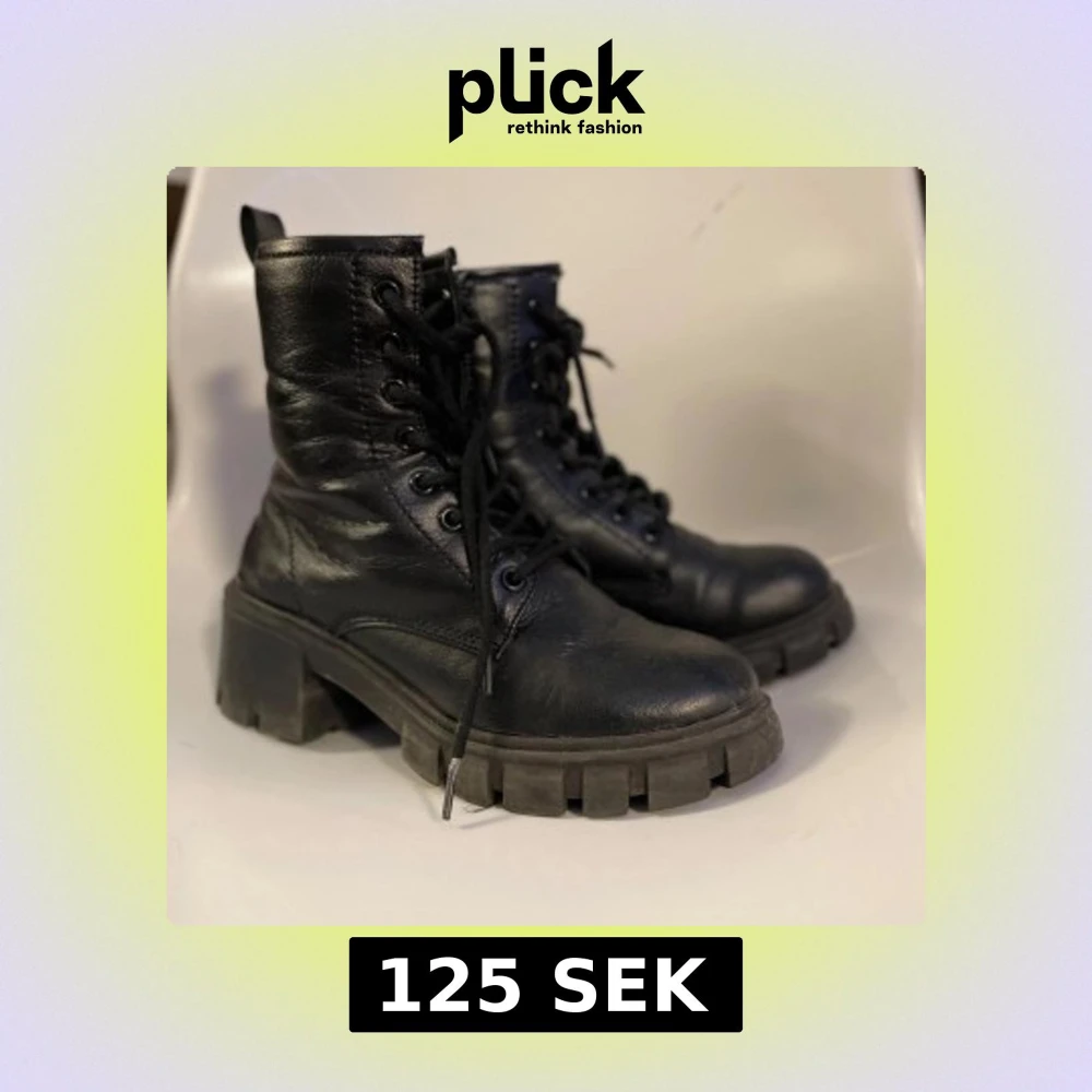 Snygga svarta boots i skinn med grov sula och snörning framtill. De har även en praktisk dragkedja på sidan för enkel på- och avtagning. Tvättar dem innan jag skickar iväg.