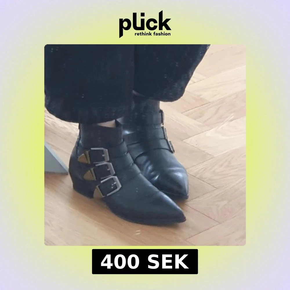 Snygga svarta boots i skinn med spetsig tå och tre dekorativa spännen på sidan.