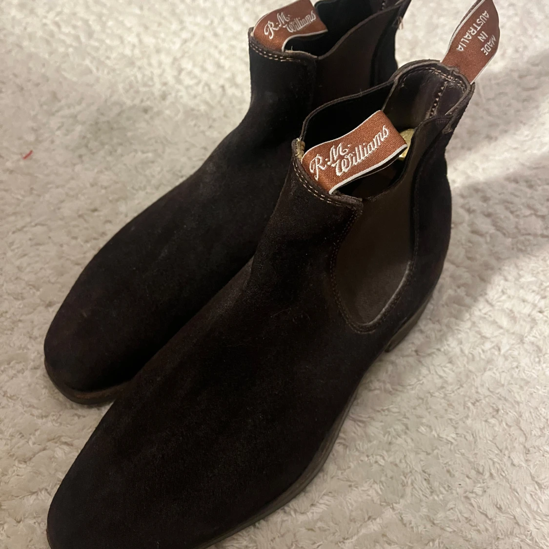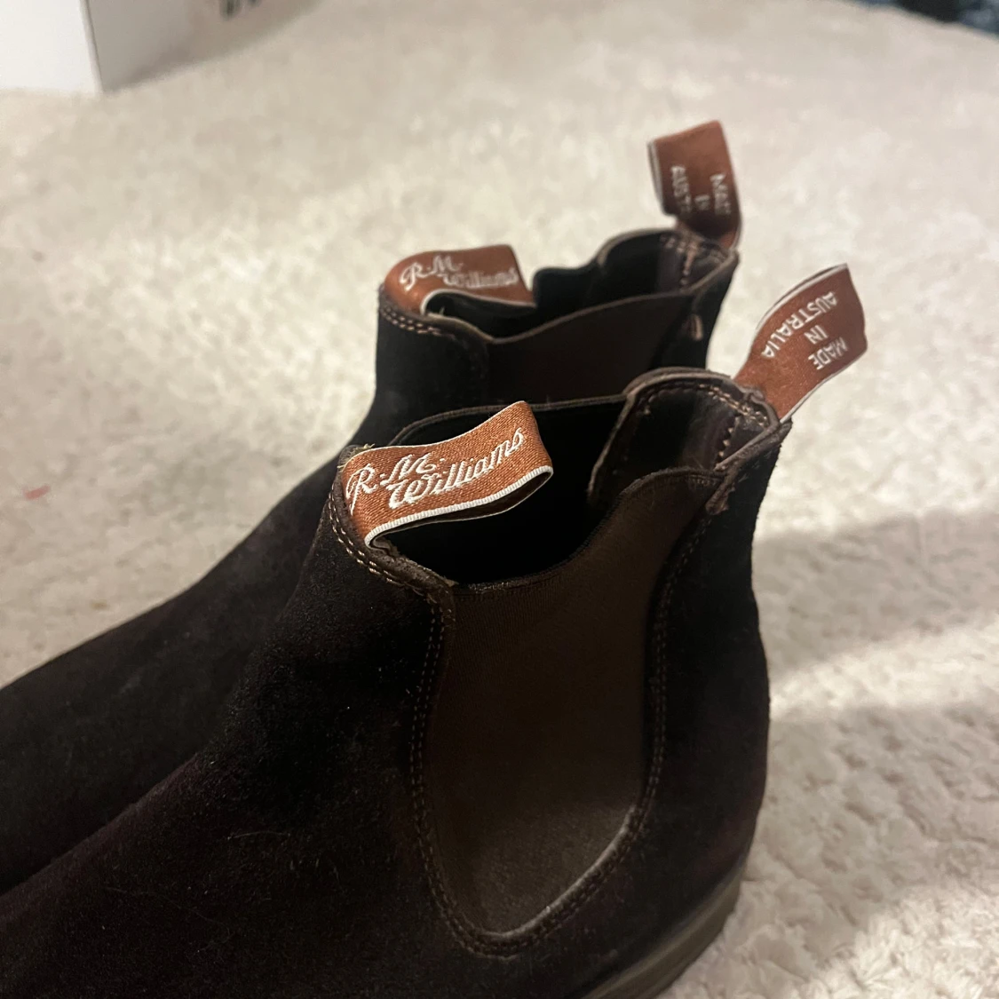 Snygga bruna Chelsea boots från R.M. Williams i mocka. De har en klassisk design med elastiska paneler på sidorna och dragflikar för enkel påtagning. Perfekta för en stilren look.