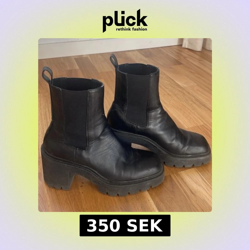 Säljer ett par svarta chelsea boots med chunky sula och låg klack. Skorna har elastiska paneler på sidorna och är tillverkade i skinn. De har en fyrkantig tå och grov yttersula som ger en cool och modern vibe.