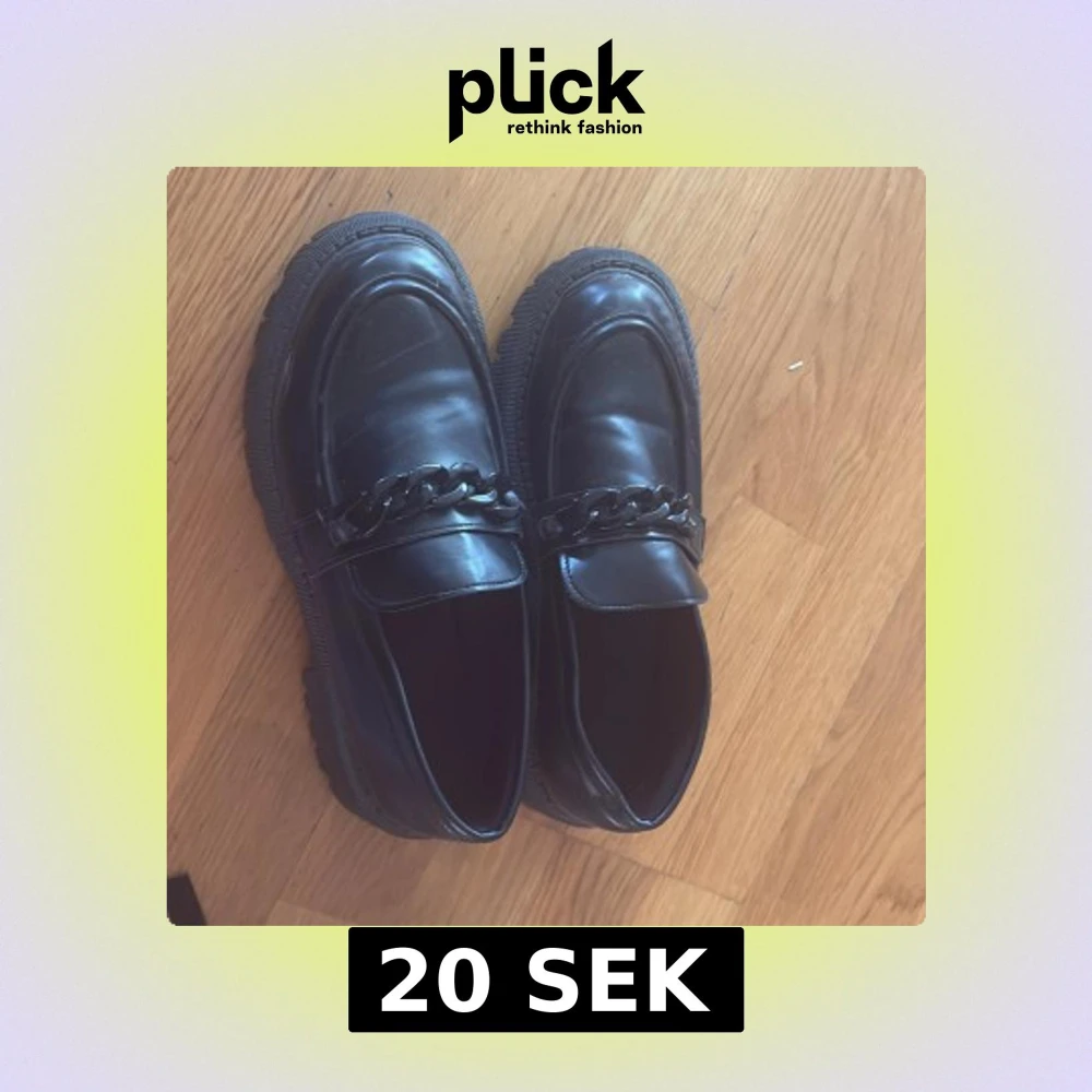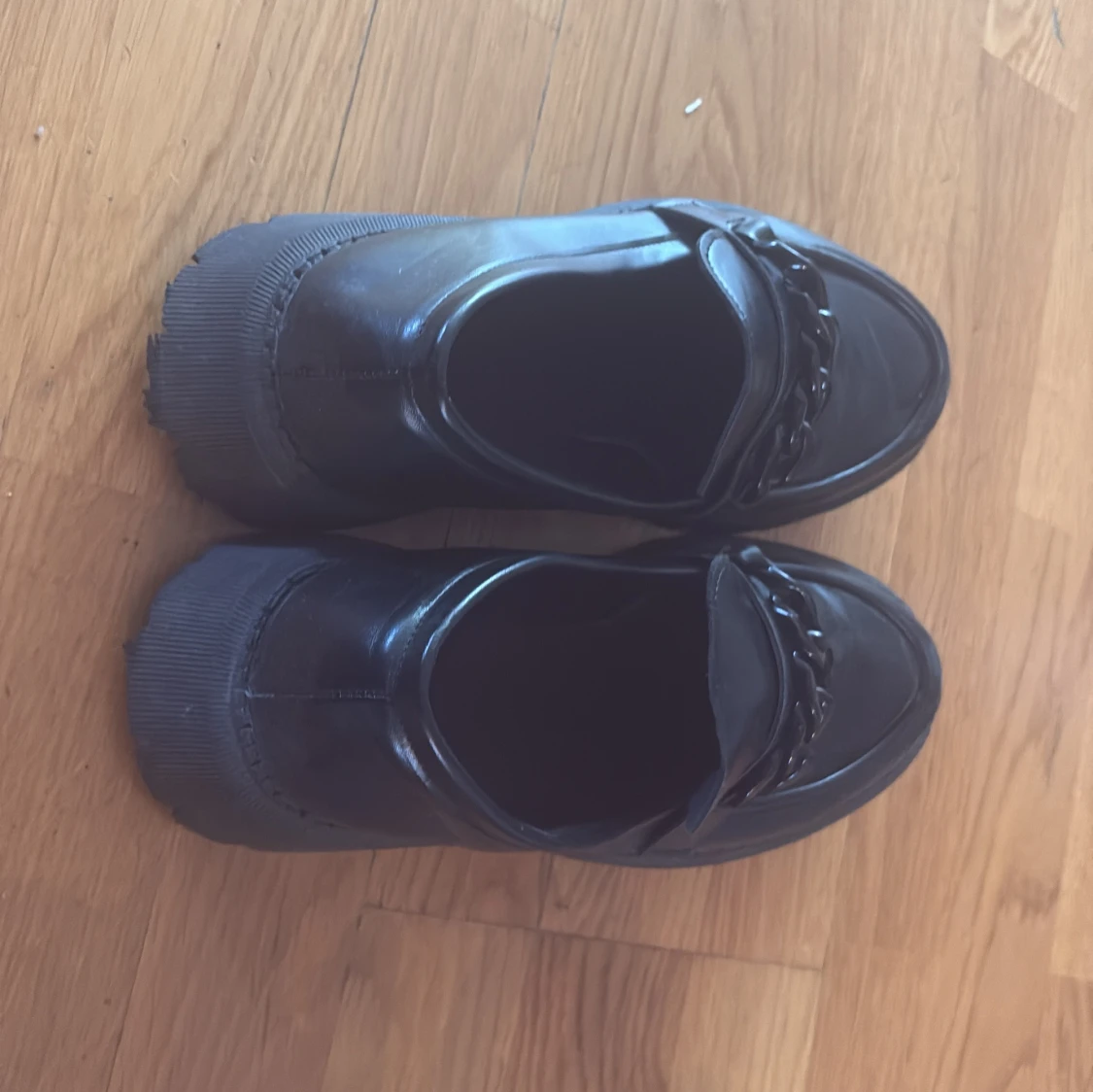 Snygga svarta loafers med chunky sula och cool kedjedetalj över foten. Skorna har rund tå och är tillverkade i glansigt syntetmaterial som ger en modern look. Perfekta för dig som vill sticka ut med din stil.