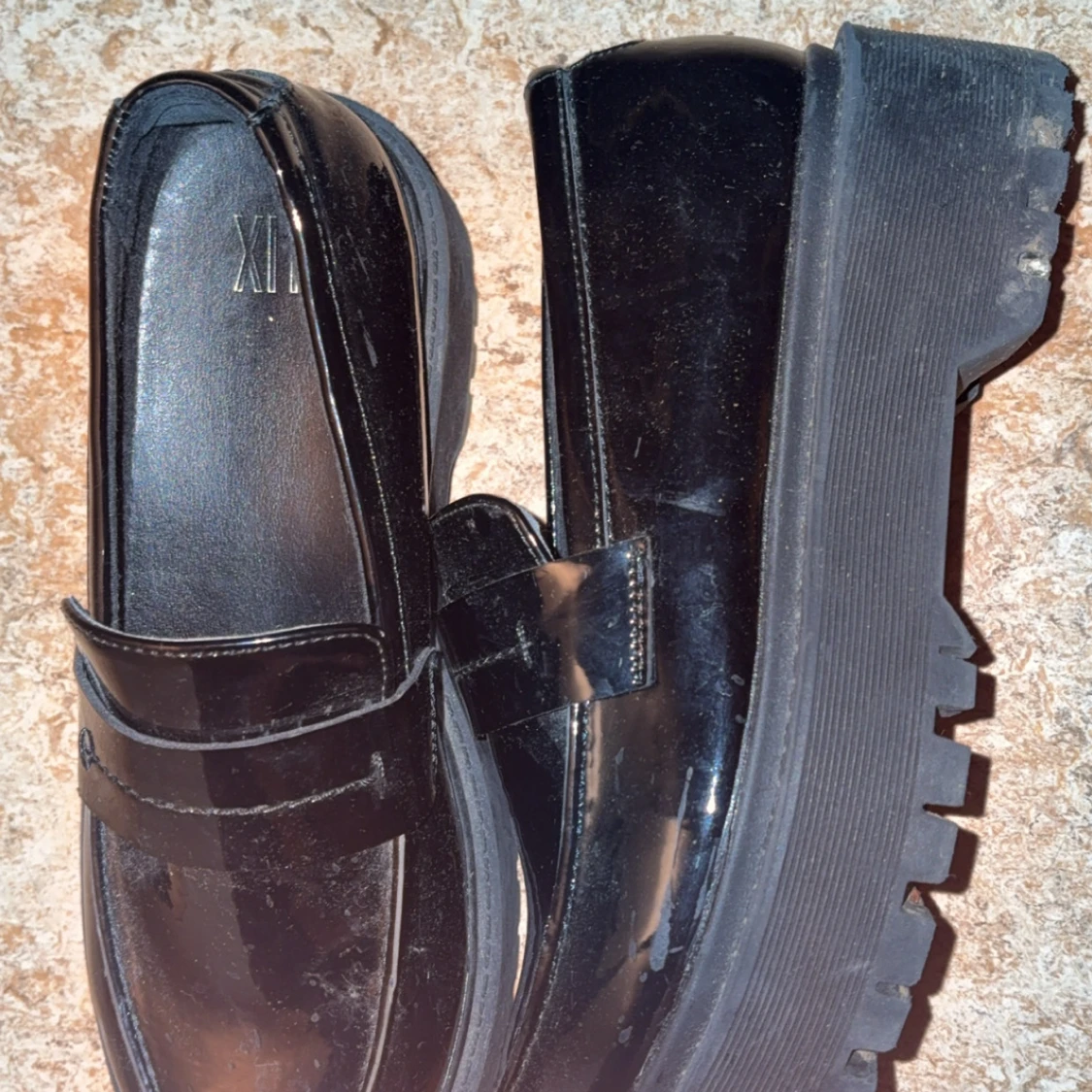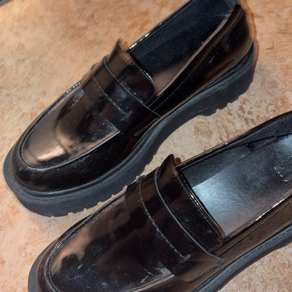Säljer ett par svarta loafers med chunky platt sula och rund tå. Skorna har en glansig finish och är tillverkade i syntetmaterial. Perfekt för dig som gillar en stilren och edgy look. Passar till både jeans och kostymbyxor.