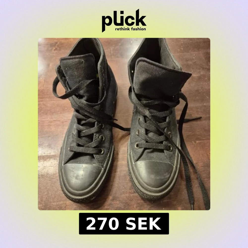 Klassiska svarta Converse All Star high-top sneakers i canvas med svarta snören och gummisula. Skorna har rund tå, platt sula och metallöljetter. Har lunarlon sula som är mjukare än den vanliga sulan. Perfekta för en cool och avslappnad stil. Unisexmodell, storlek 39 (24,5 cm). Använda någon enstaka gång.