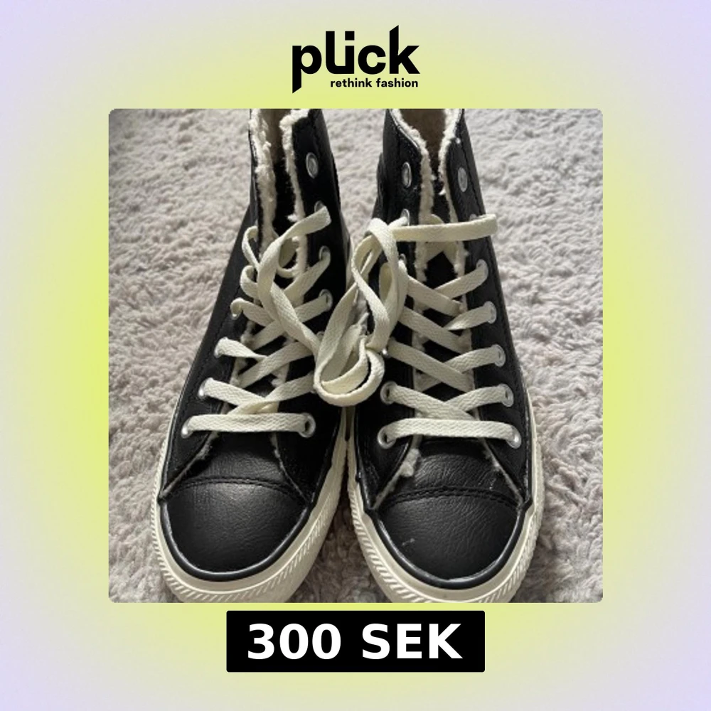Svarta Converse All Star high-top sneakers i skinn med vitt teddyfoder på insidan. Klassisk vit sula och vita snören, rund tå och platt sula. Perfekta för kyligare dagar med sin varma insida och ikoniska look. Helt i nyskick, knappt använda.
