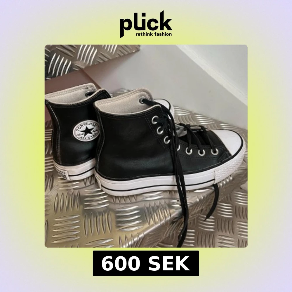 Snygga svarta Converse All Star med hög platåsula och klassisk vit tå. Skorna har snörning, silverfärgade öljetter och är tillverkade i skinn. Perfekta för dig som vill ha en tidlös och cool look med extra höjd. Använda max 2-3 gånger annars bara stått i garderoben