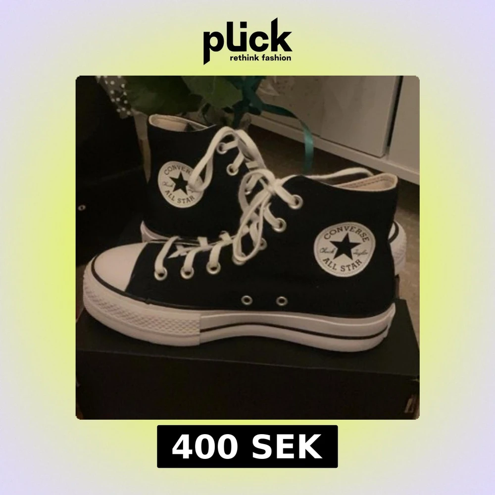 Klassiska svarta Converse All Star sneakers med hög snörning och vit sula. Perfekta för en avslappnad stil och passar till det mesta i garderoben. Perfekta nu till sommaren. Nypris 800kr aäljer för 400 de är använda några gånger men i perfekt skick. pris kan diskuteras