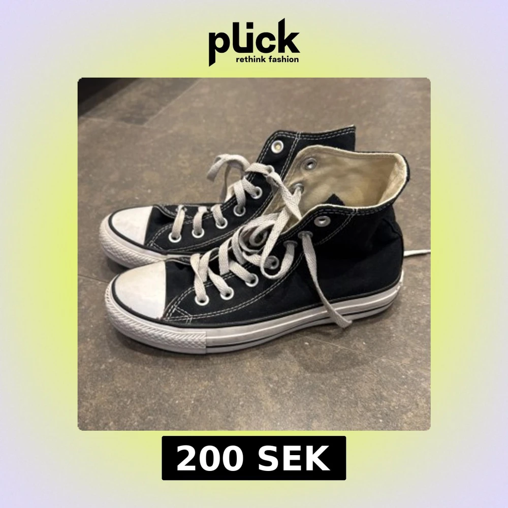 Klassiska svarta Converse All Star sneakers med hög modell och vita snören. Skorna har den ikoniska logotypen på sidan och en vit gummisula. Storlek 36