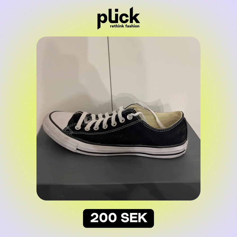 Klassiska svarta Converse All Star sneakers i canvas med vit sula och snörning. Perfekta för vardagsbruk och ger en avslappnad stil. De har den ikoniska loggan på hälen och är i bra skick.