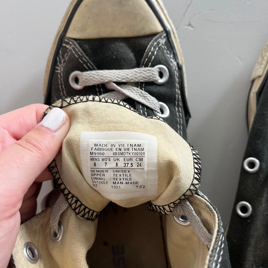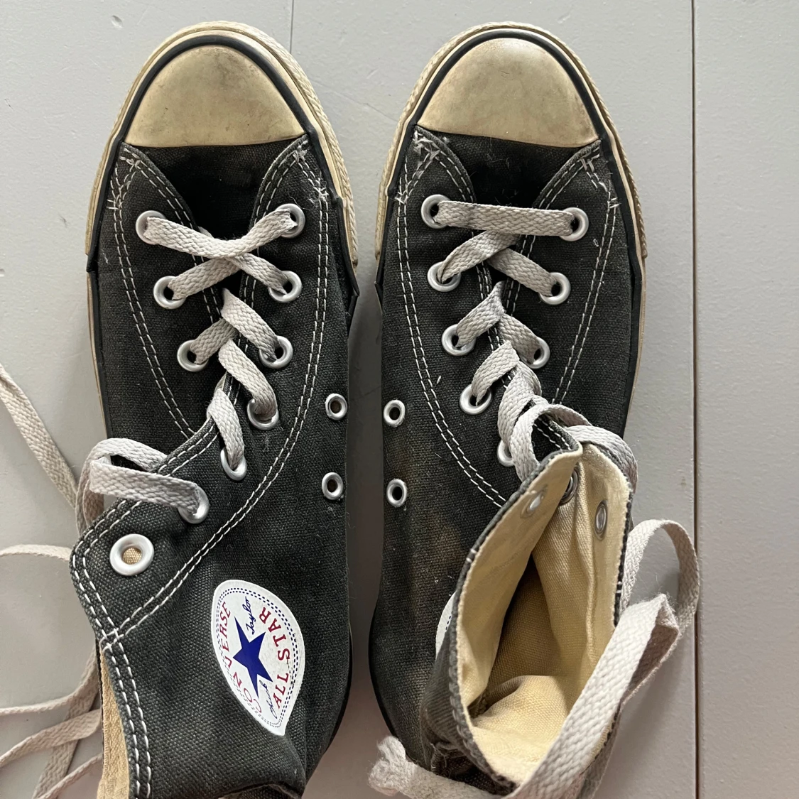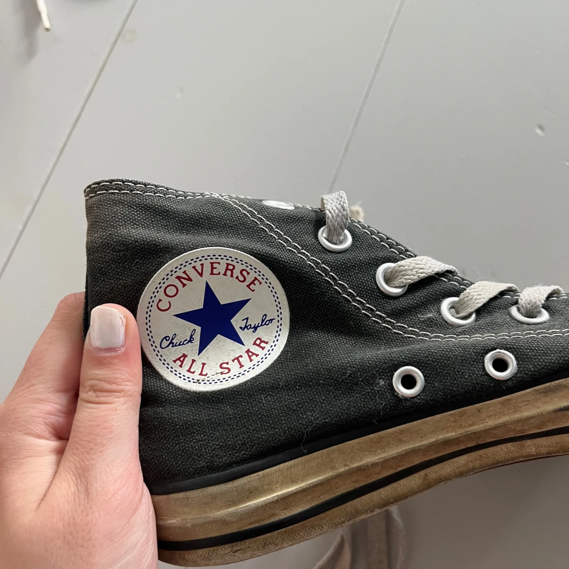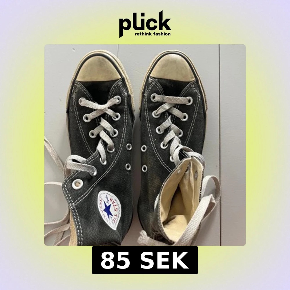 Klassiska mörkgråa Converse Chuck Taylor All Star med vita snören och rund tå. Skorna har vit sula med svart rand och tydlig logga på sidan. Tillverkade i textil med kontrasterande sömmar och metallöljetter för snörning. Storlek 37,5.