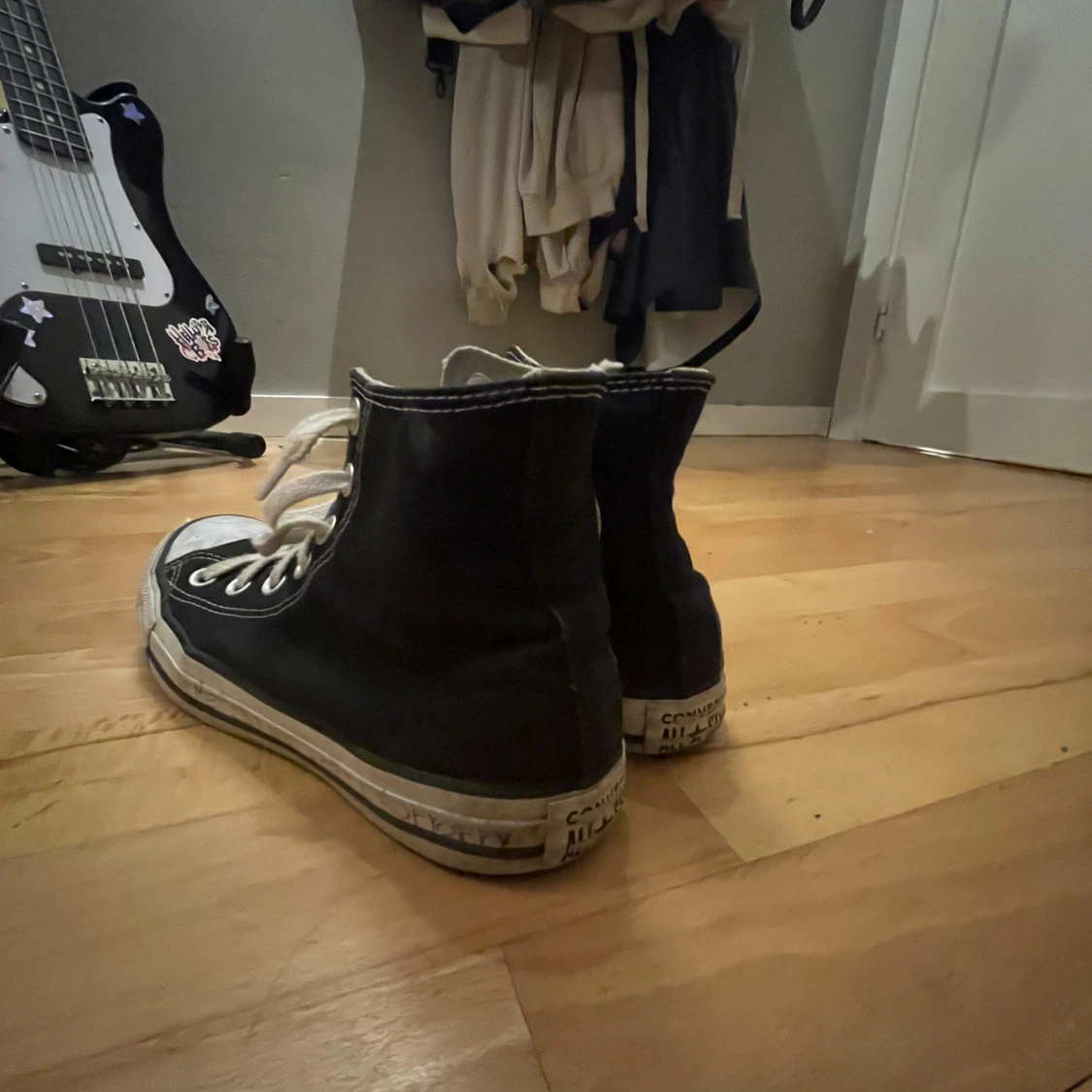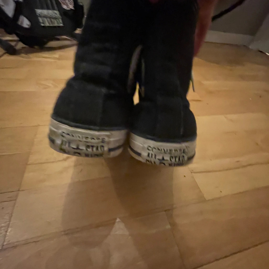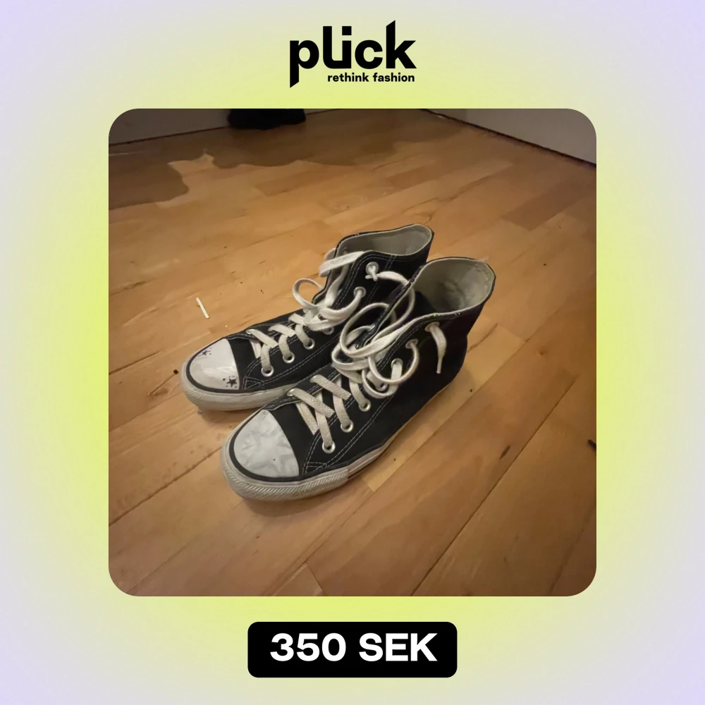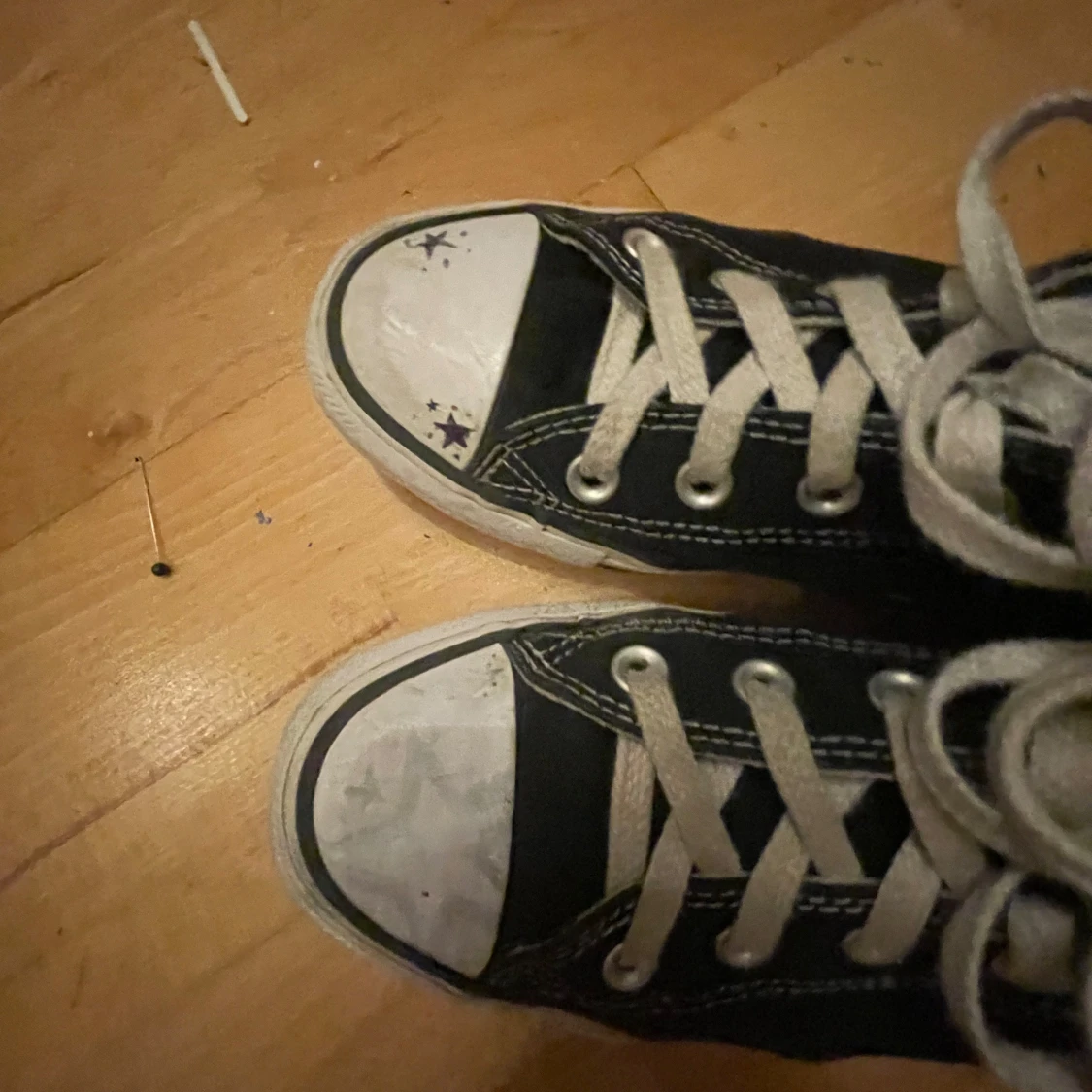 Säljer ett par klassiska svarta Converse All Star sneakers i bra skick. De har vita snören och en vit gummisula med lite slitage. Perfekta för vardagsbruk och ger en avslappnad stil. Storleken är inte angiven, men de passar de flesta. Lite ritade på men de e sånt som går o få bort!