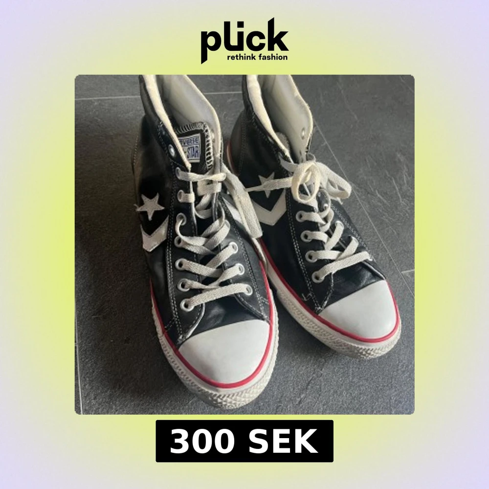 Säljer ett par klassiska svarta Converse one Star sneakers med vita detaljer och snörning. Skorna har en hög modell med den ikoniska stjärnan på sidan och en röd rand längs sulan. Köpta 2012 och är väldigt sparsamt använda, lite fläckar på sulan ⭐️