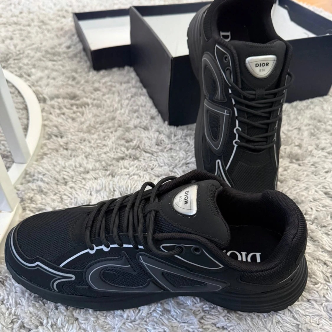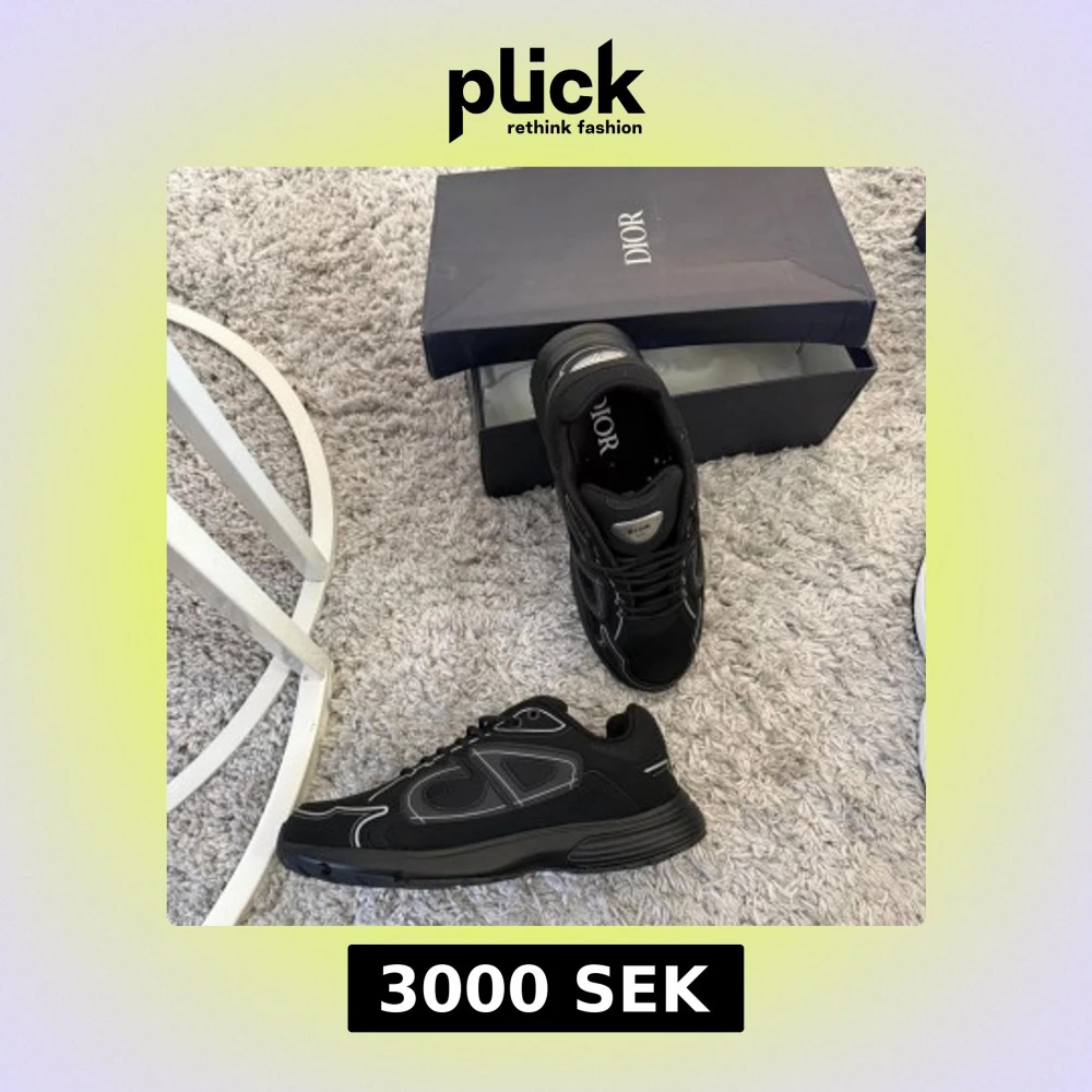Säljer ett par svarta Dior B30 sneakers med coola reflekterande detaljer och tydlig Dior-logga på plösen. Skorna har en chunky sula, mesh och syntetpaneler samt snörning framtill. Perfekta för dig som vill ha en lyxig och modern look.
