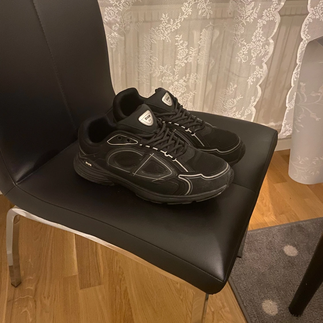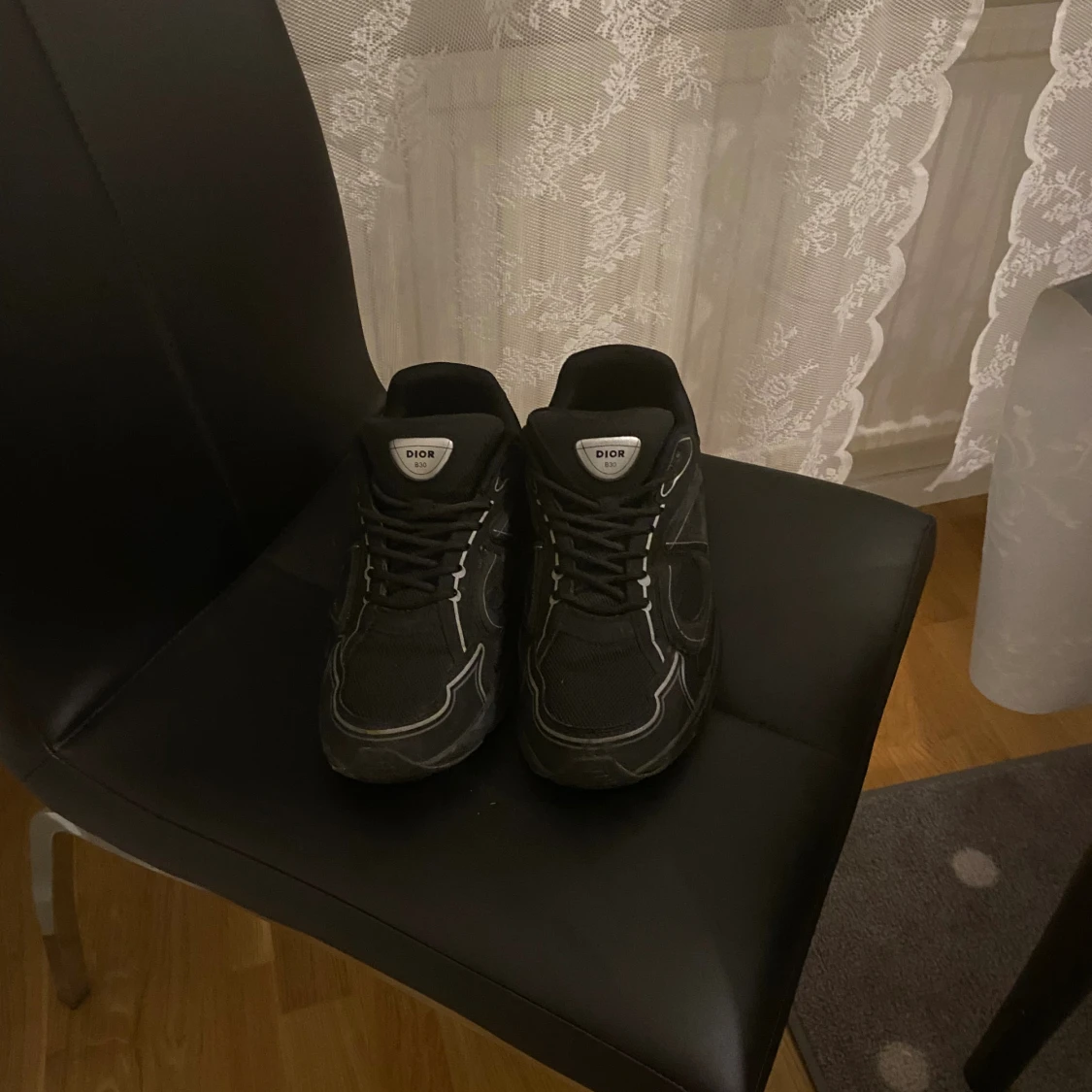 Säljer ett par svarta Dior sneakers med silvriga detaljer och tydlig Dior-logga på plösen. Skorna har snörning, rund tå och platt sula. Materialmix av textil och syntet ger en sportig och clean look. Perfekta för dig som gillar exklusiva och trendiga sneakers.