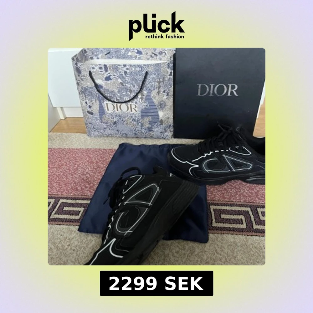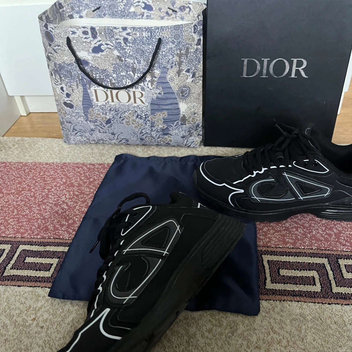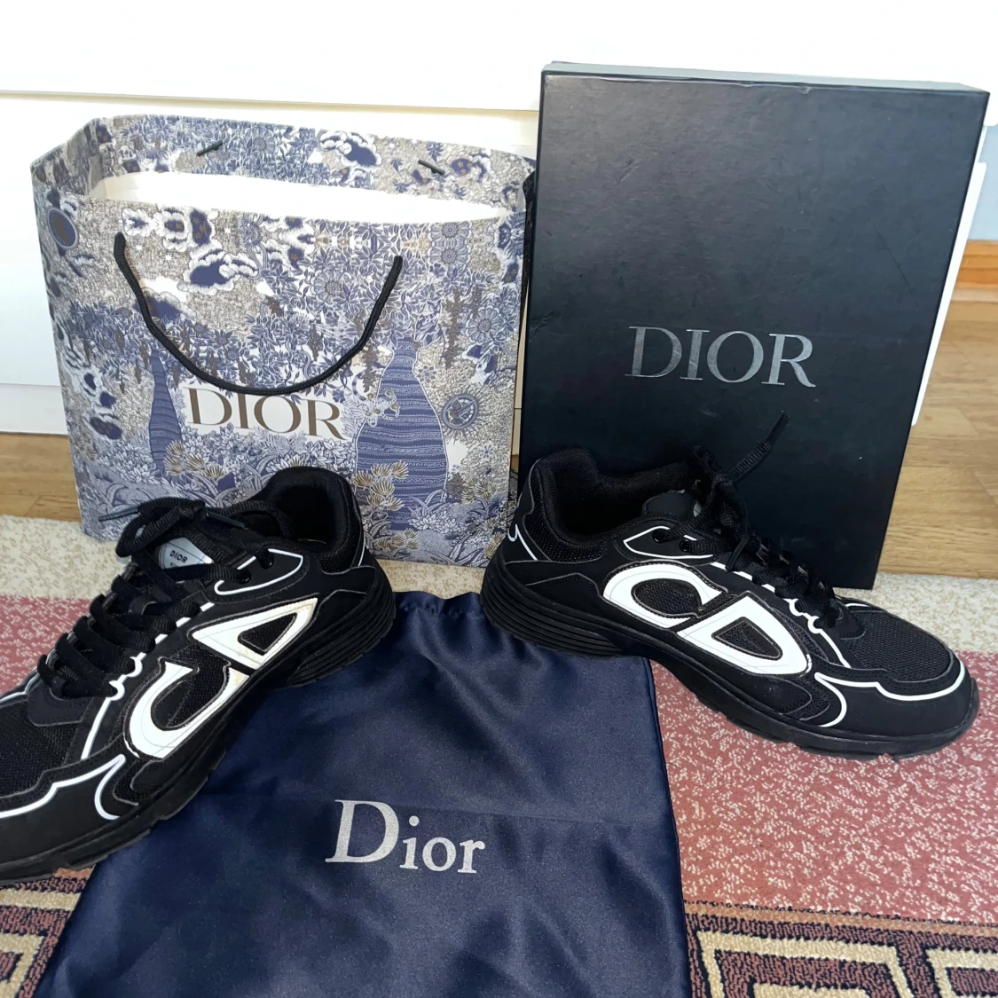 Säljer ett par svarta Dior sneakers med vita kontrastdetaljer och tydlig CD-logga på sidan. Skorna har snörning och en chunky sula för en modern look. Kommer med originalpåse, kartong och Dior-påse. Perfekta för dig som vill sticka ut med lyxig streetstyle.