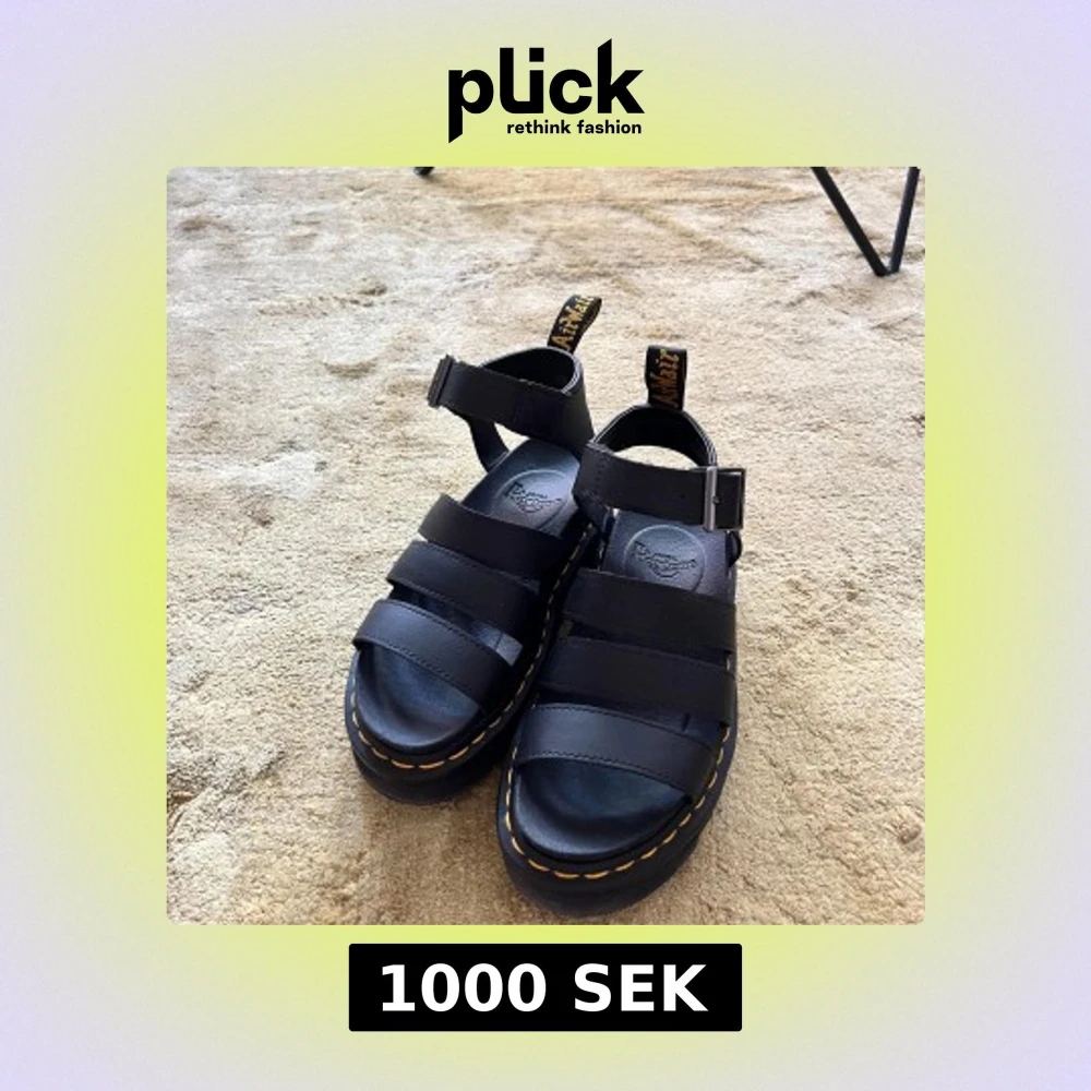 Chunky svarta sandaler från Dr. Martens med breda remmar i skinn, justerbart spänne vid ankeln och klassisk gul söm runt sulan. Använt en gång.