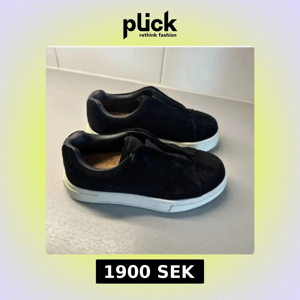 Svarta sneakers i mjuk mocka med vit platt sula. Skorna har en stilren och enkel design utan synlig snörning, vilket ger en clean look. Perfekta för dig som gillar minimalistisk stil och vill ha något som funkar till det mesta.