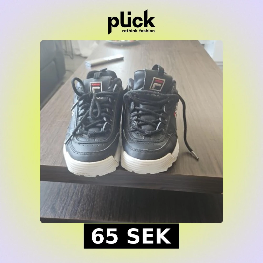 Chunky svarta Fila Disruptor sneakers med vit, kraftig sula och snörning. Skorna har Fila-logga på sidan, plösen och hälen. Tillverkade i syntetmaterial med rund tå och platt sula. Perfekta för dig som gillar streetstyle och vill sticka ut.