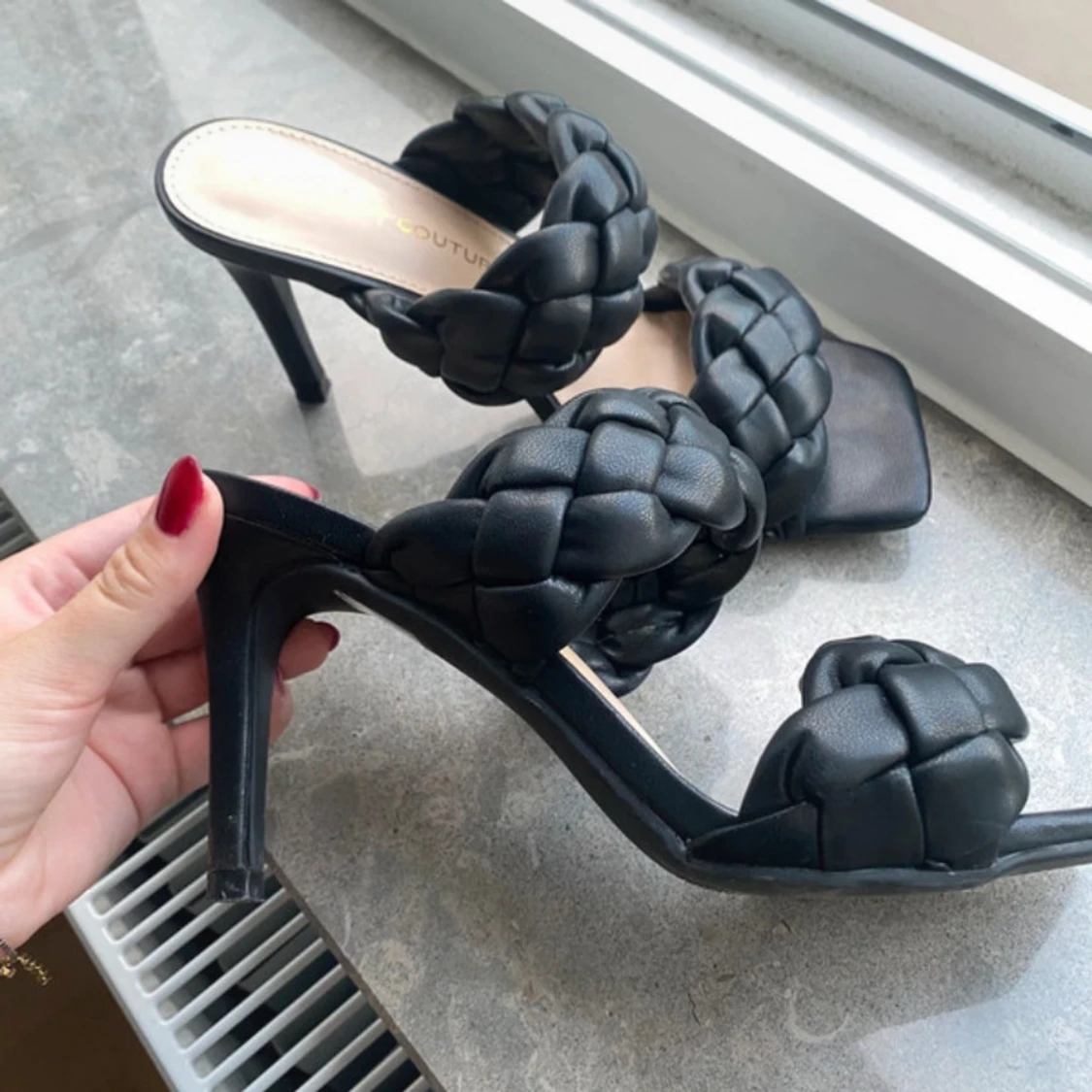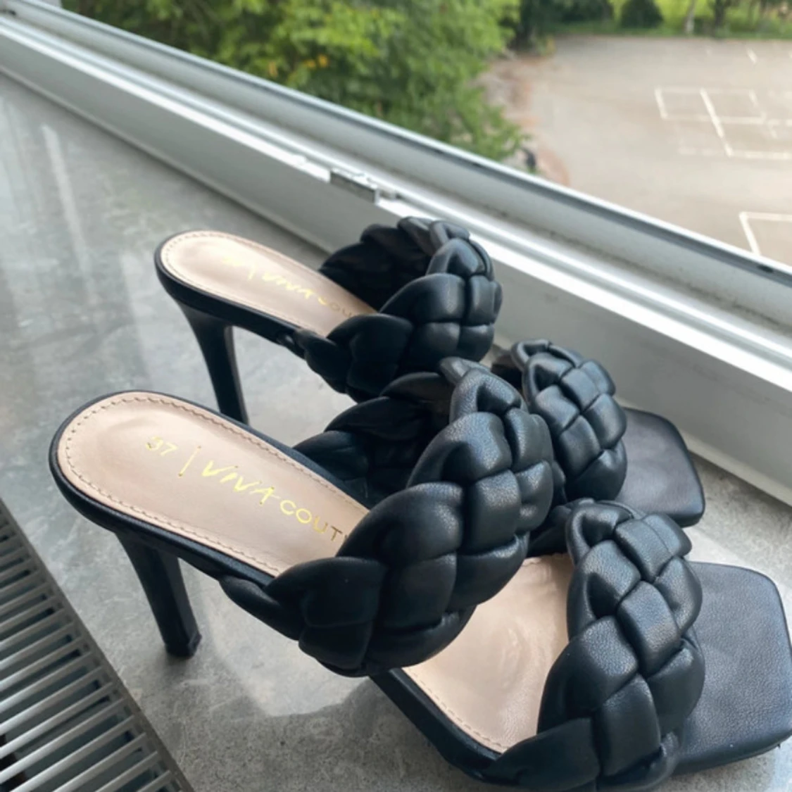 Snygga svarta sandaler med hög klack från Viva Couture. Skorna har två breda, flätade remmar över foten och fyrkantig tå. Tillverkade i syntetmaterial med en stilren och modern look. Perfekta för dig som vill sticka ut med trendiga detaljer.Från newyorker
