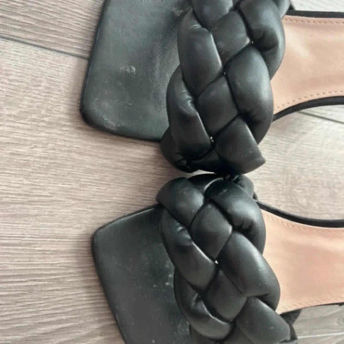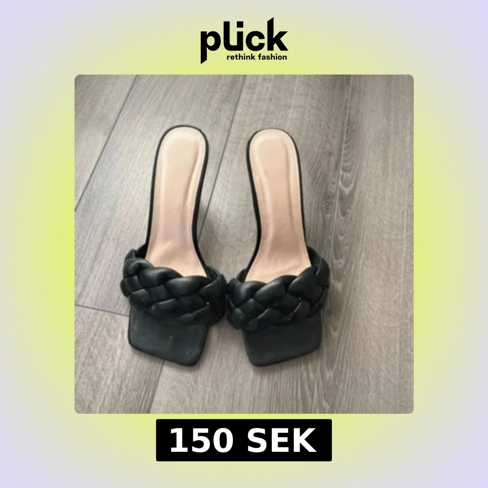Stilrena svarta sandaler med fyrkantig tå och låg klack. Skorna har en bred, flätad rem i skinnimitation över foten och öppen häl. Perfekta för dig som gillar trendiga och minimalistiska detaljer.