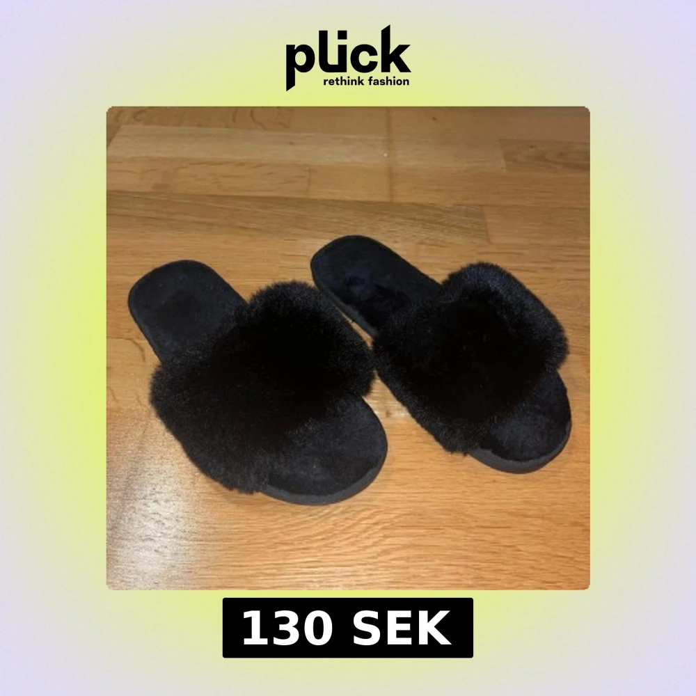Svarta sandaler med bred rem täckt av mjukt, fluffigt pälsmaterial., storlek 38-39.