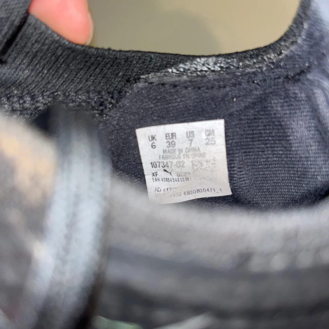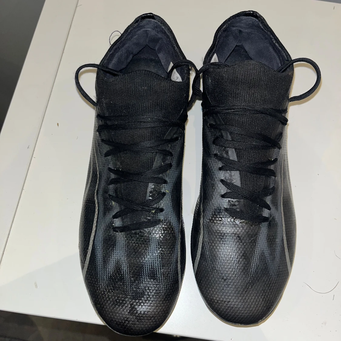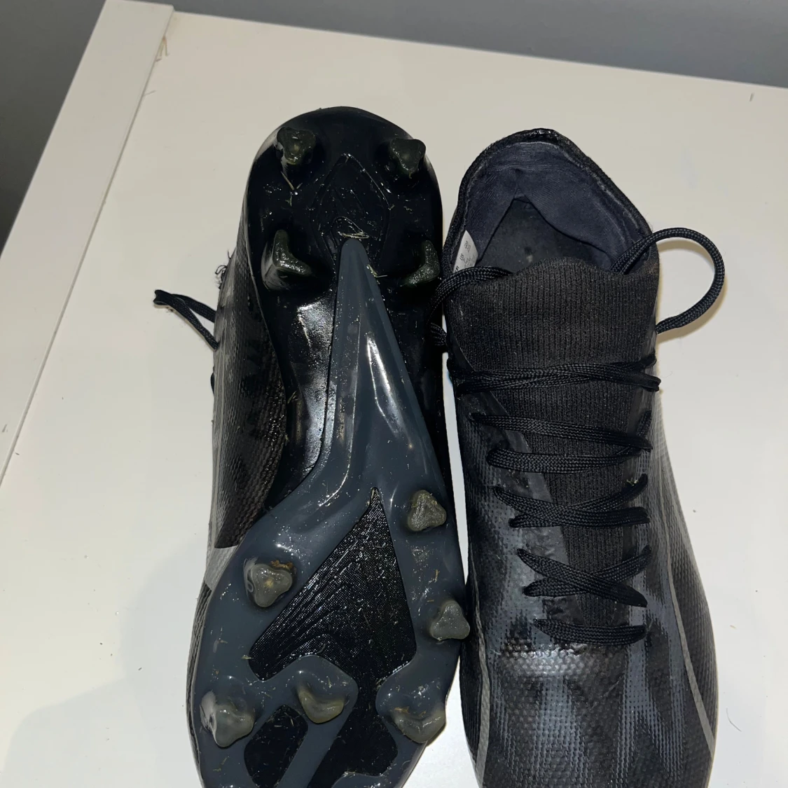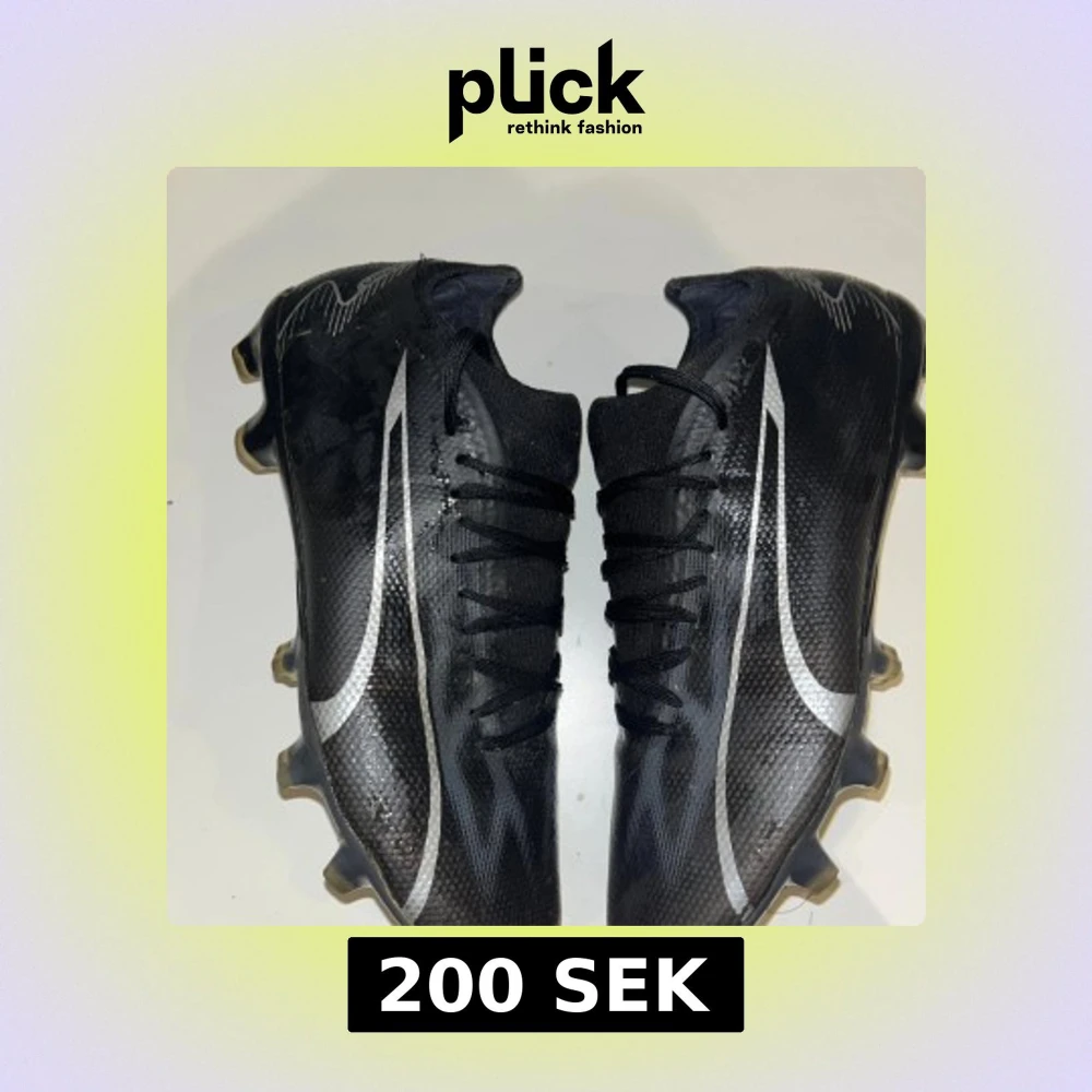 Säljer ett par svarta fotbollsskor från Puma i storlek 39. Skorna har en snygg, sportig design med silvriga detaljer och snörning. Ovandelen är i syntetmaterial och sulan har fasta dobbar för bra grepp på planen. Perfekta för dig som vill ha stilrena och snabba skor på matchen.