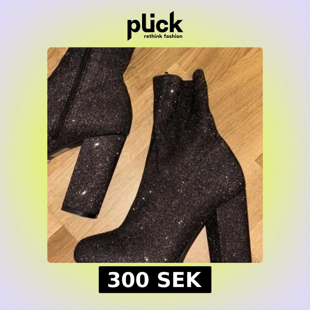 Säljer ett par svarta stövletter med glittrigt material och hög klack. Skorna har en rejäl platåsula och dragkedja på sidan. Perfekta för att sticka ut och ge extra höjd till din outfit.