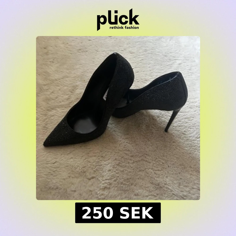 Snygga svarta pumps från Steve Madden med glittriga detaljer. Skorna har spetsig tå och hög klack, vilket ger en elegant och trendig look. Materialet är täckt av små svarta stenar som ger extra bling. Har endast använts som sittsko och ej gåtts i