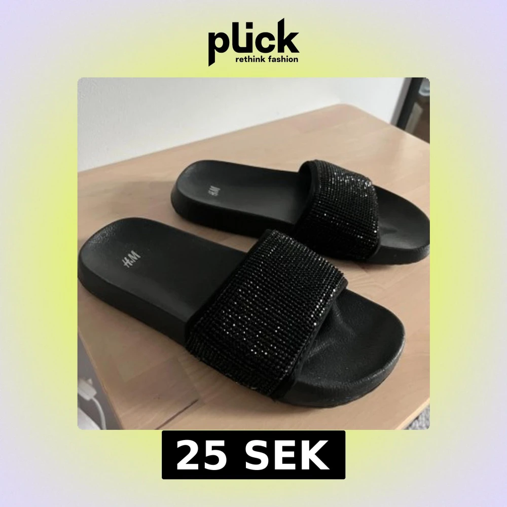 Svarta sandaler från H&M med bred rem täckt av små svarta glittrande pärlor. Platt sula med räfflad undersida för extra grepp. Perfekt om man ska utomlands eller som innetofflor. Väldigt bekväma och aldrig använda, endast testade.