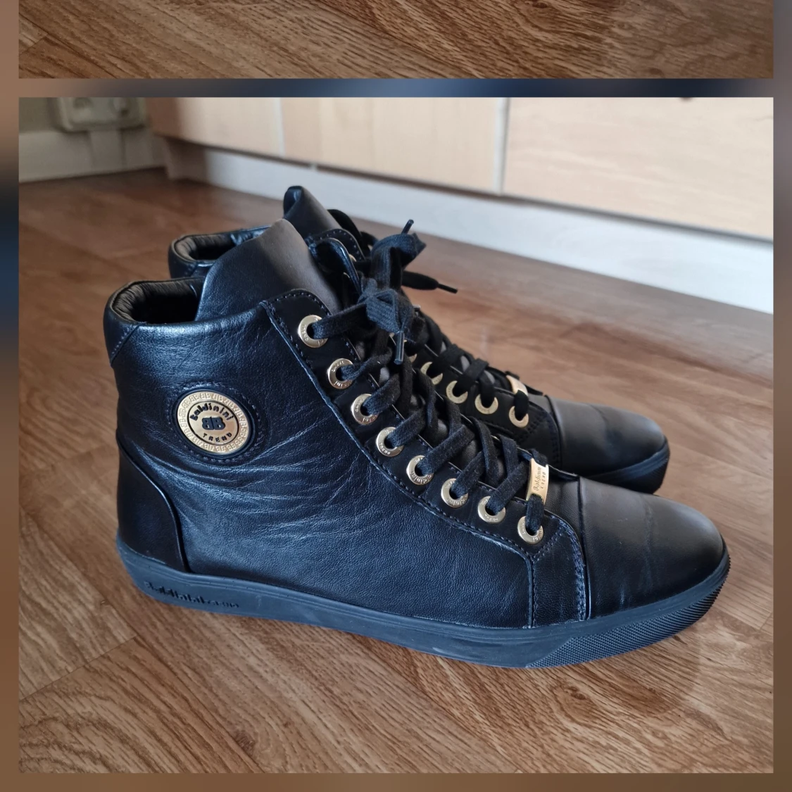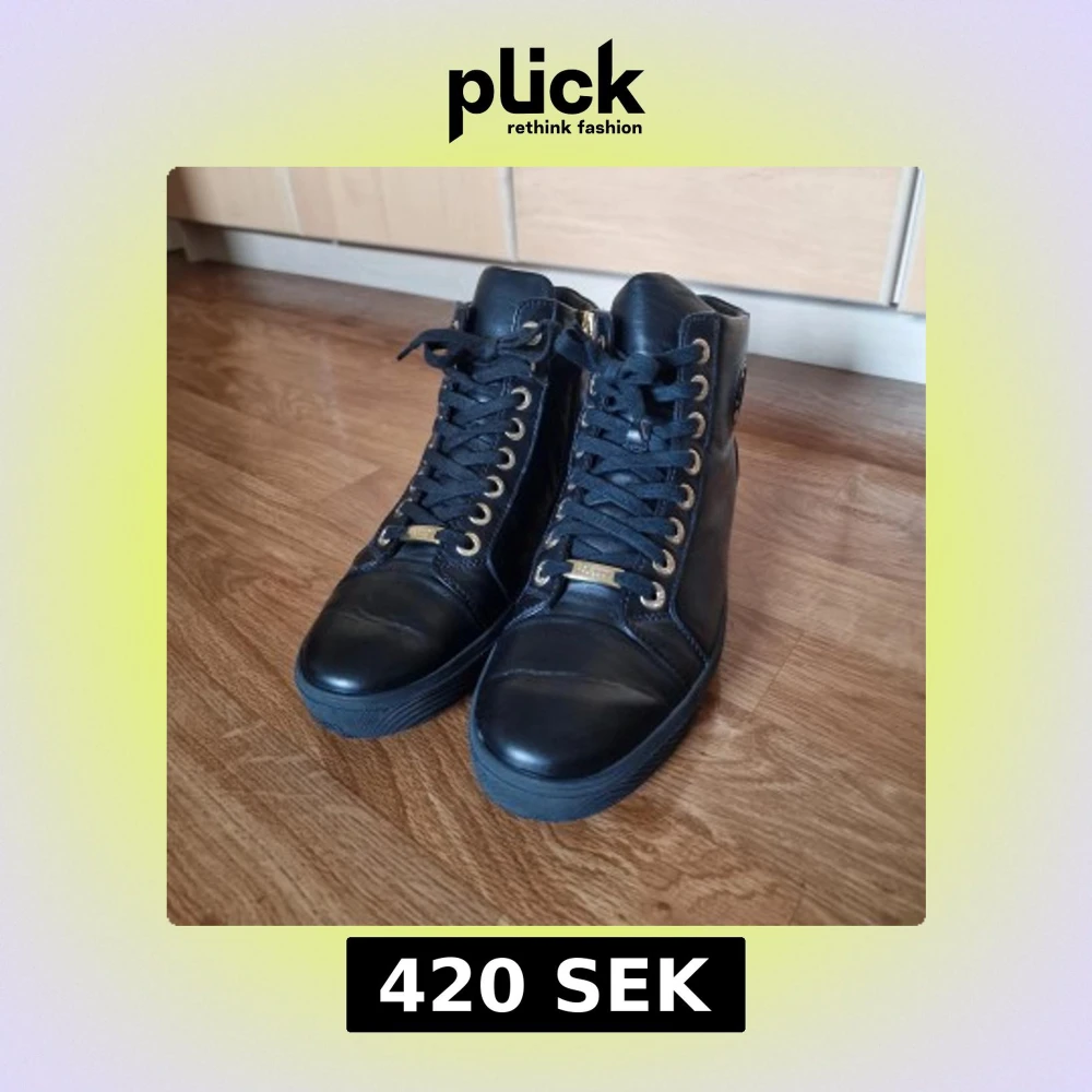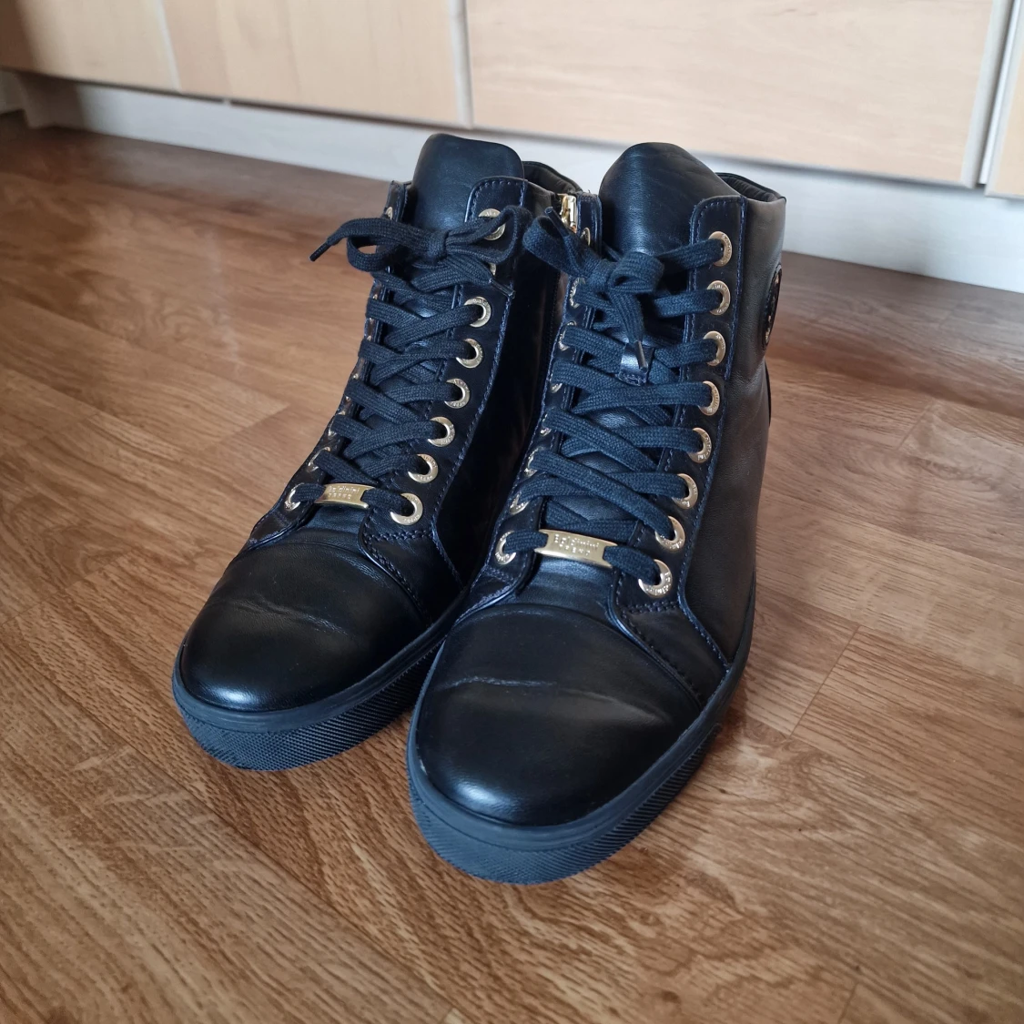 Snygga svarta high-top sneakers från Baldinini i skinn med guldfärgade metalldetaljer och snörning. Klassisk rund tå och platt sula, samt logga på sidan. Perfekta för dig som vill ha en stilren och lyxig look. Använda 1 gång.