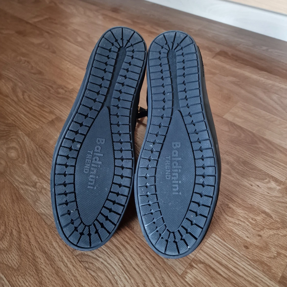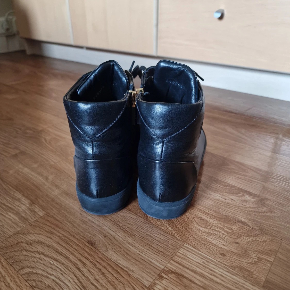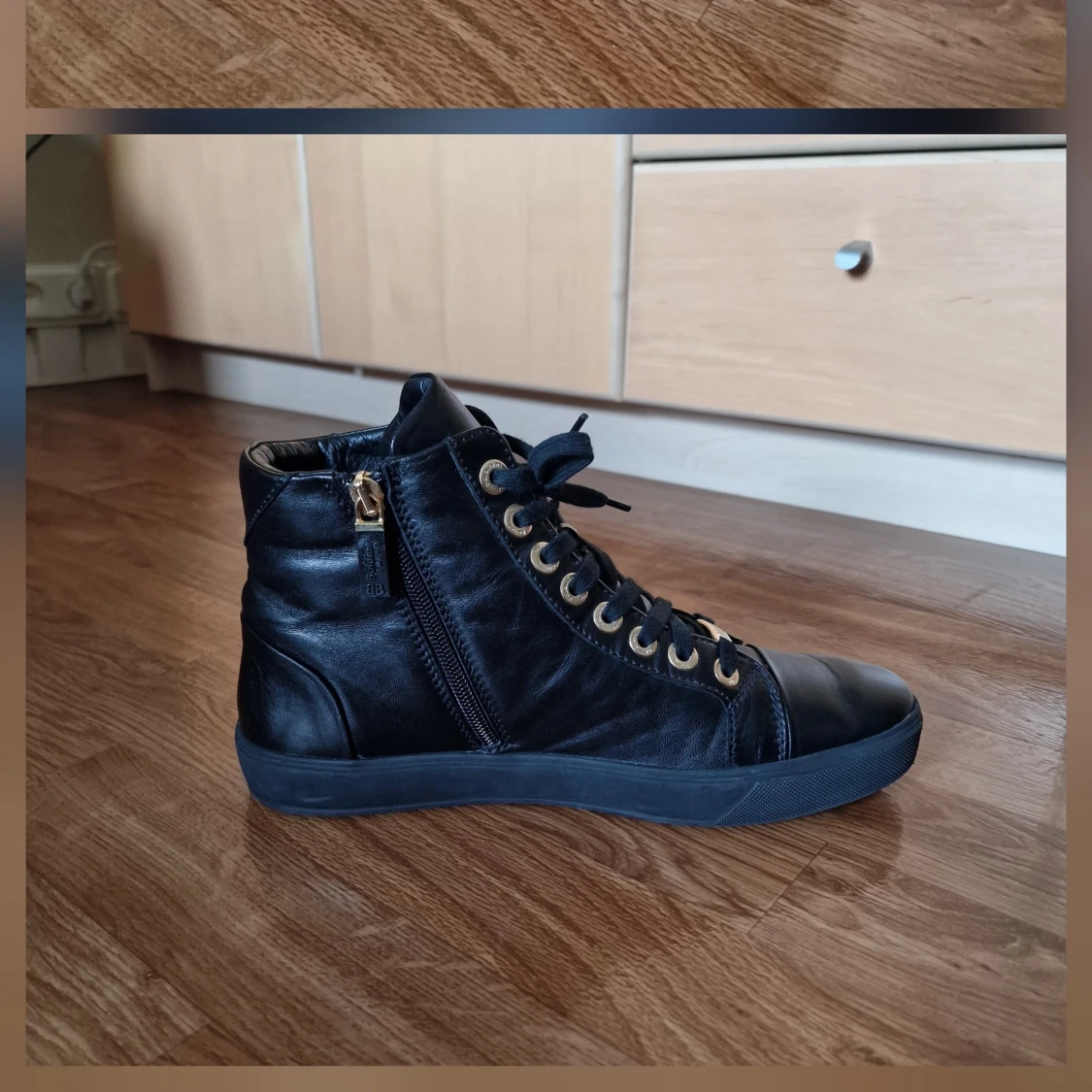 Snygga svarta high-top sneakers från Baldinini i skinn med guldfärgade metalldetaljer och snörning. Klassisk rund tå och platt sula, samt logga på sidan. Perfekta för dig som vill ha en stilren och lyxig look. Använda 1 gång.