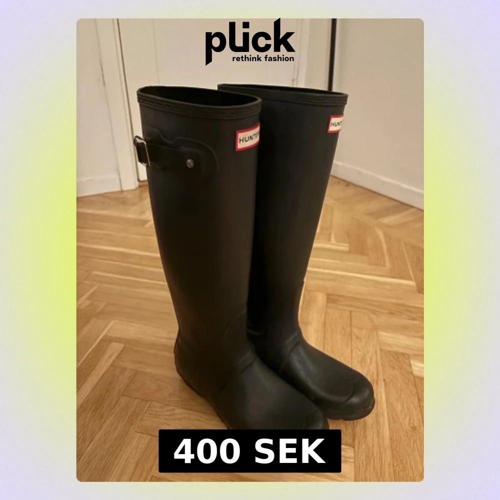 Klassiska svarta gummistövlar från Hunter med högt skaft och spänne på sidan. Stövlarna har rund tå, platt sula och tydlig Hunter-logga framtill. Lite slitna på insidan men ger ett fint helhets intryck, se bilder 🩷