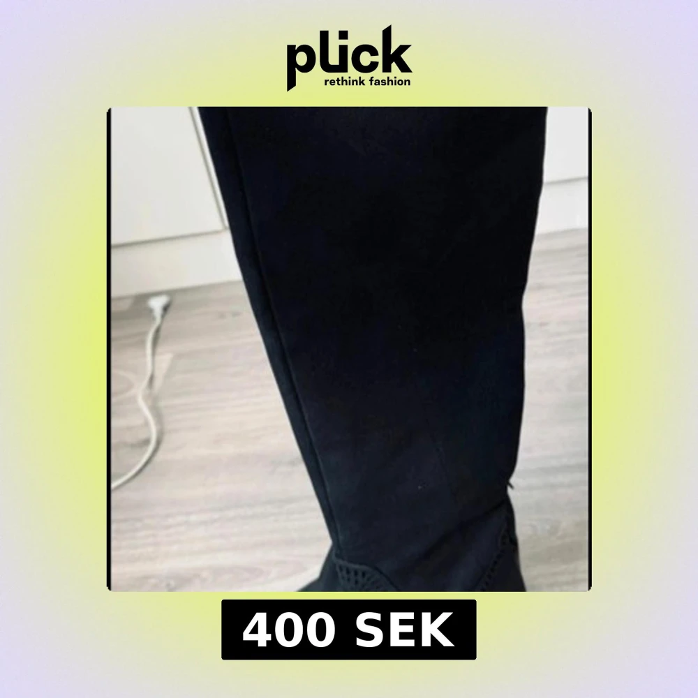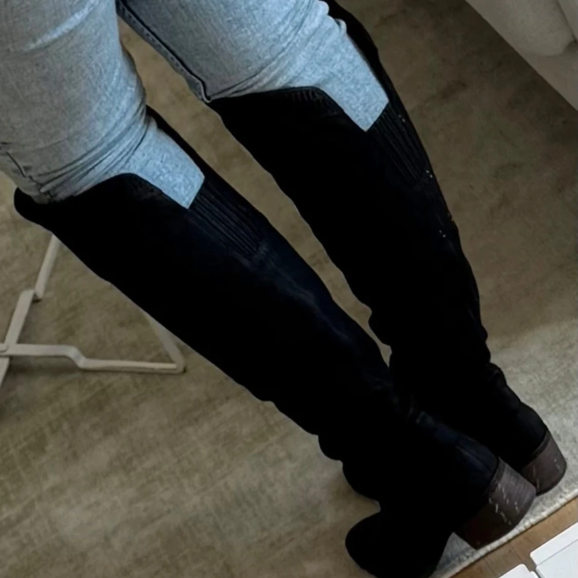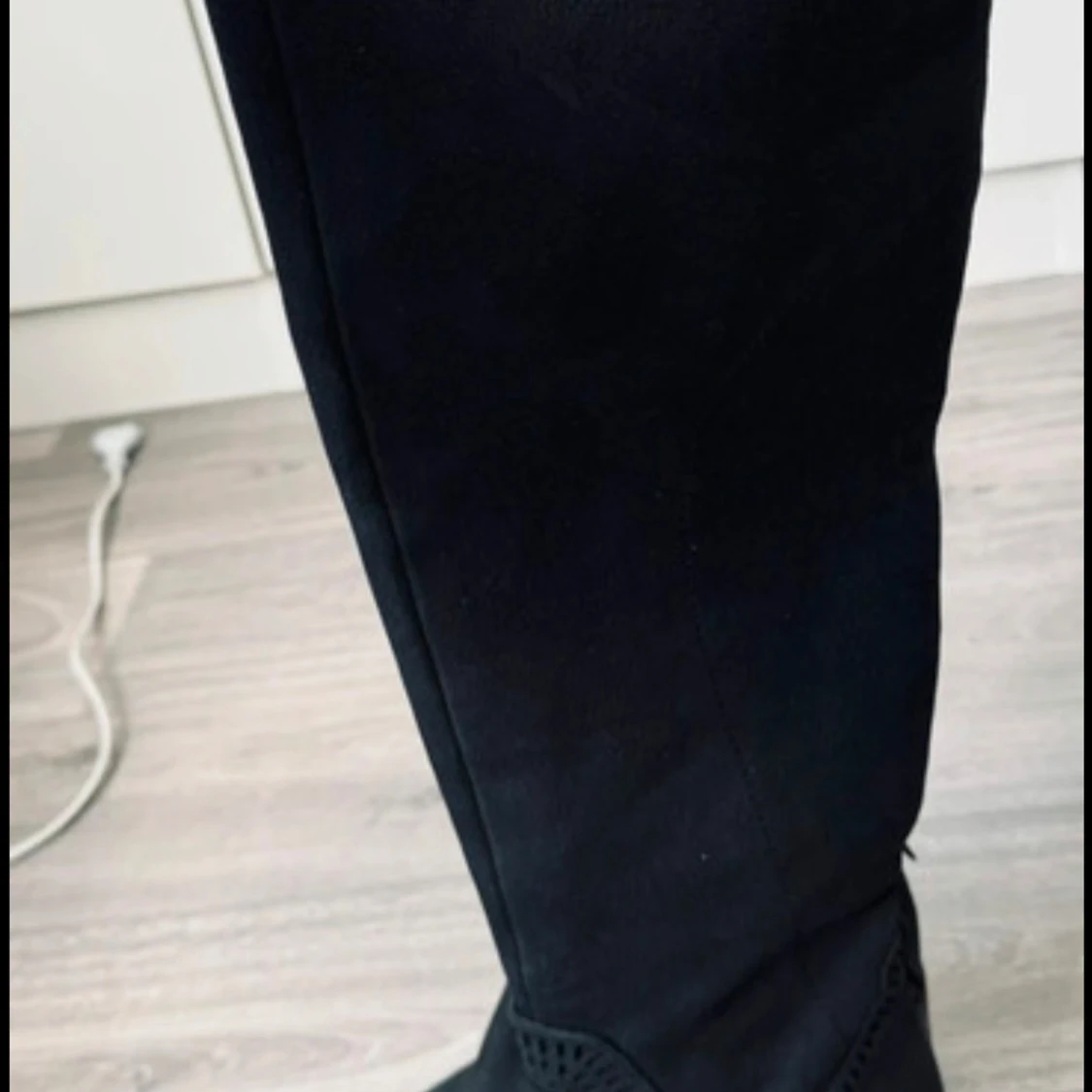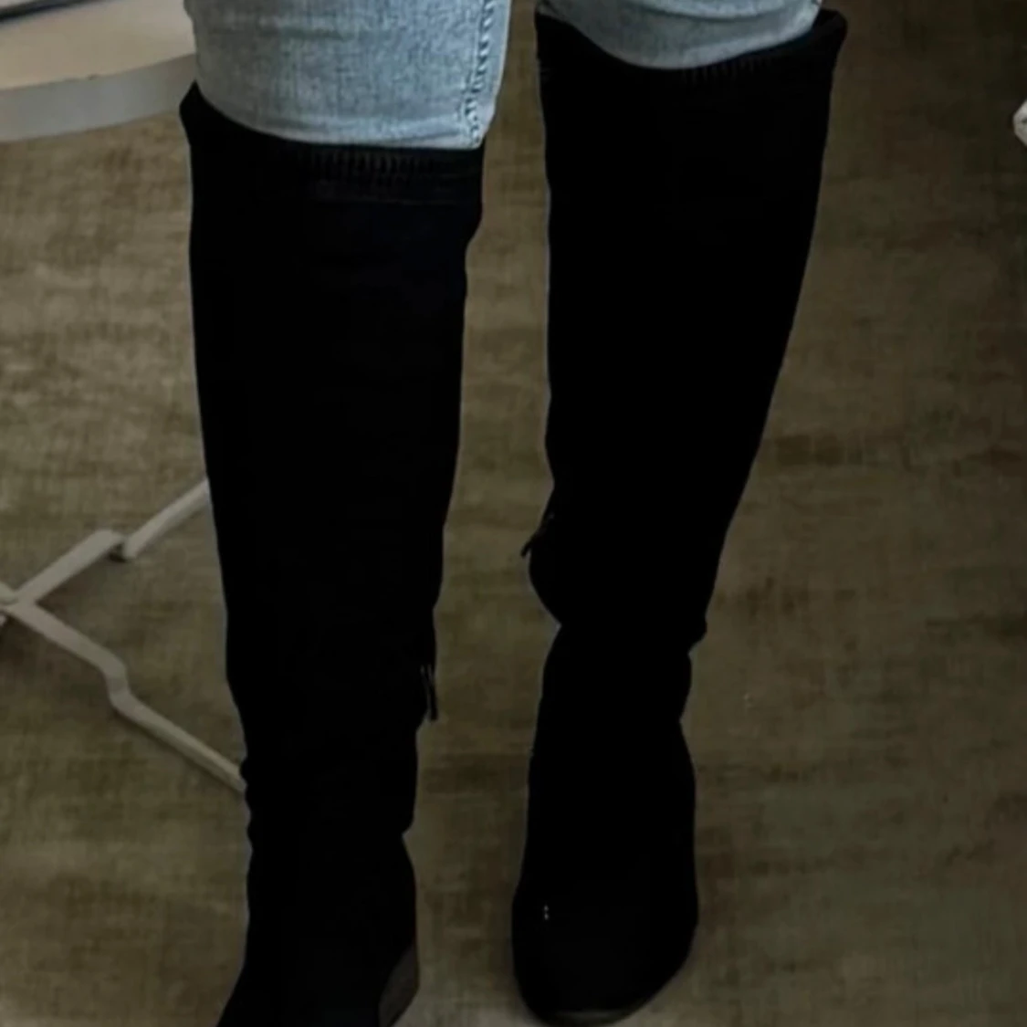 Snygga svarta stövlar i mocka med högt skaft som går över knäet. De har en låg klack och rund tå, samt diskreta sömdetaljer upptill. Perfekta till jeans eller kjol för en trendig look.