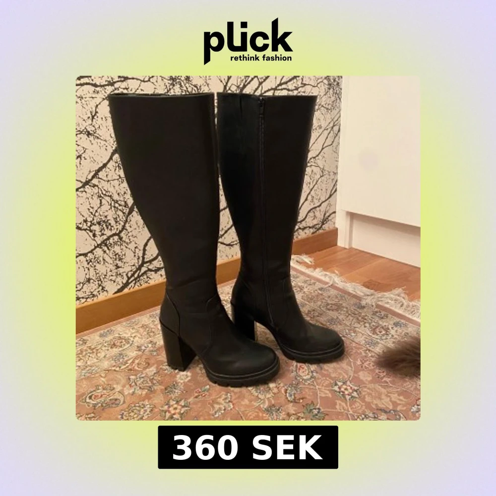 Snygga svarta stövlar i skinn med hög klack och dragkedja på sidan. Perfekta för höst och vinter. Endast använda 2 gånger men har fått märken, dessa syns knappt från långt håll då de är så svarta. Priset kan alltid diskuteras