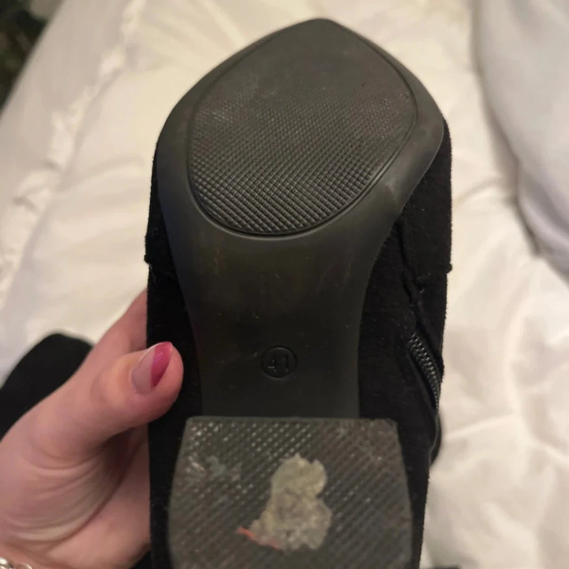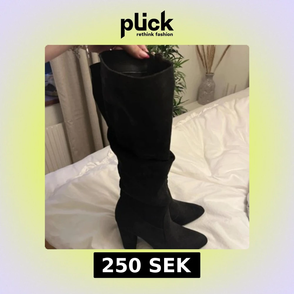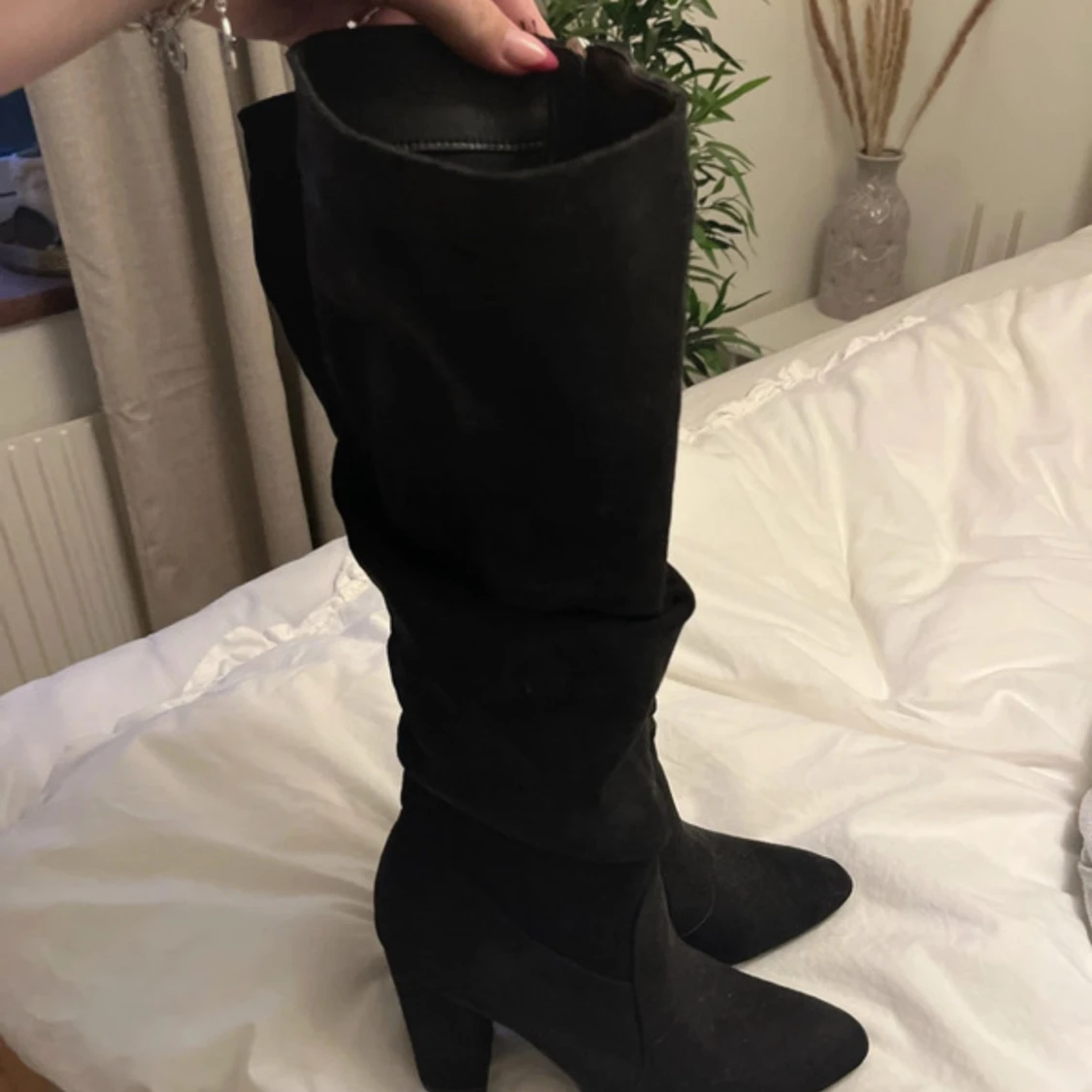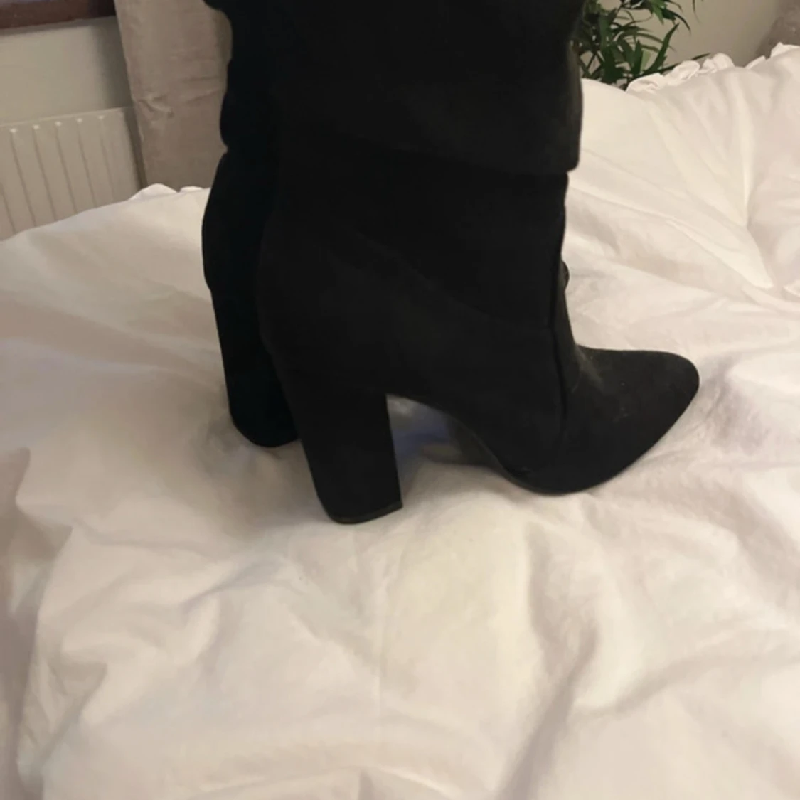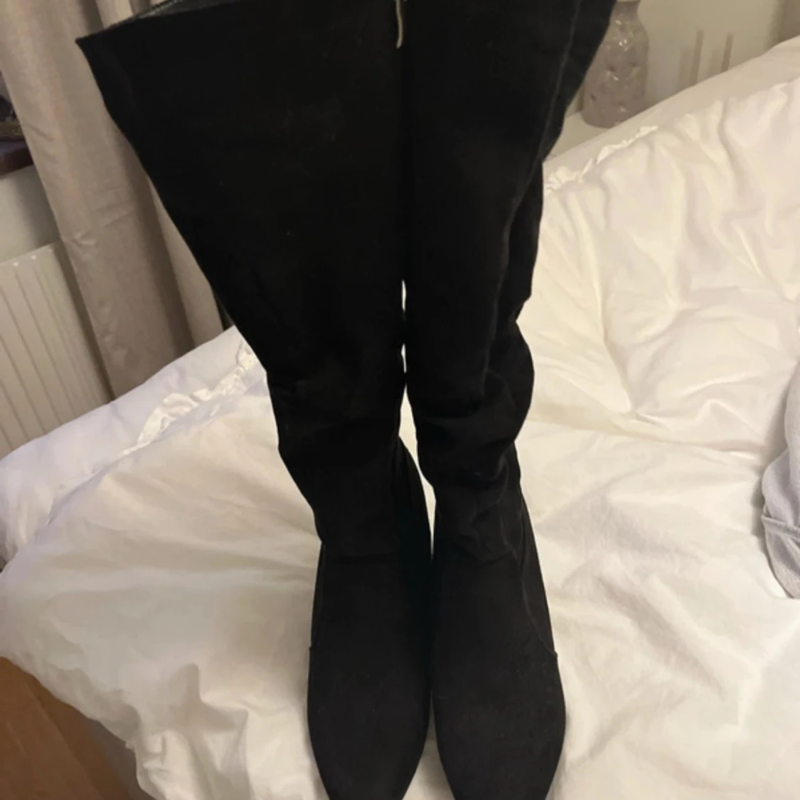 Säljer ett par svarta höga stövlar i mocka-look med chunky klack och spetsig tå. Stövlarna har en stilren design och går upp över knäet, perfekta till både kjol och jeans. Materialet är mjukt och ger en lyxig känsla. Använda en gång säljer då de ej passar längre