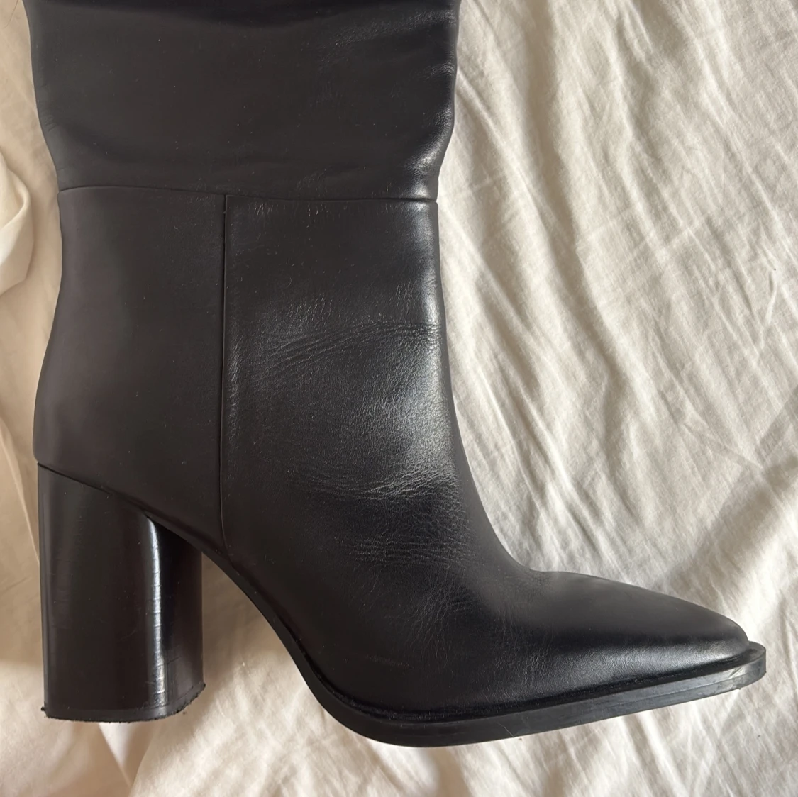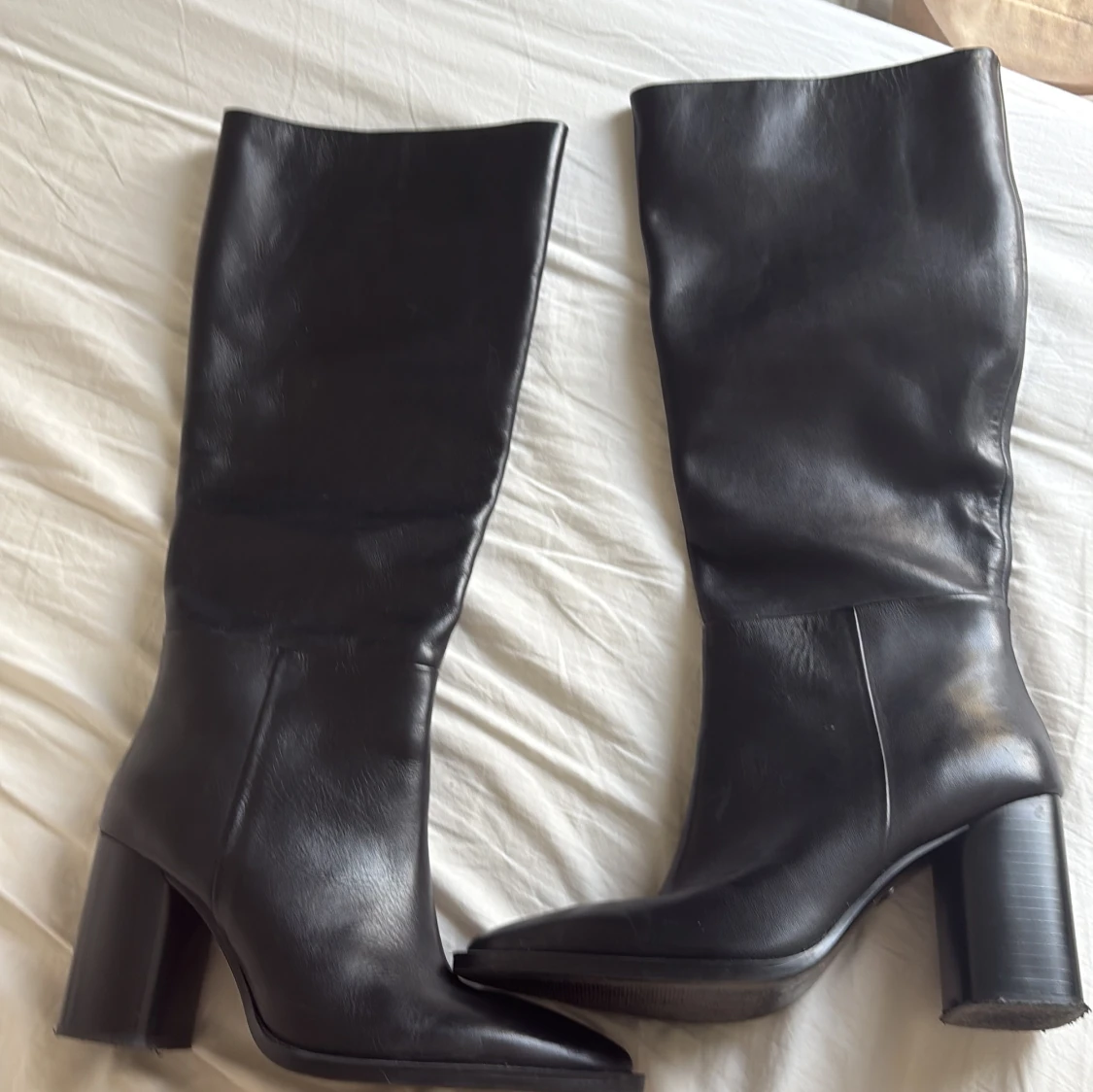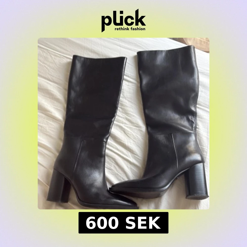 Snygga svarta stövlar i skinn med hög, rundad klack och spetsig tå. Stövlarna är knähöga och har en stilren, minimalistisk design som passar perfekt till både jeans och kjol. Materialet är slätt och ger en lyxig känsla.