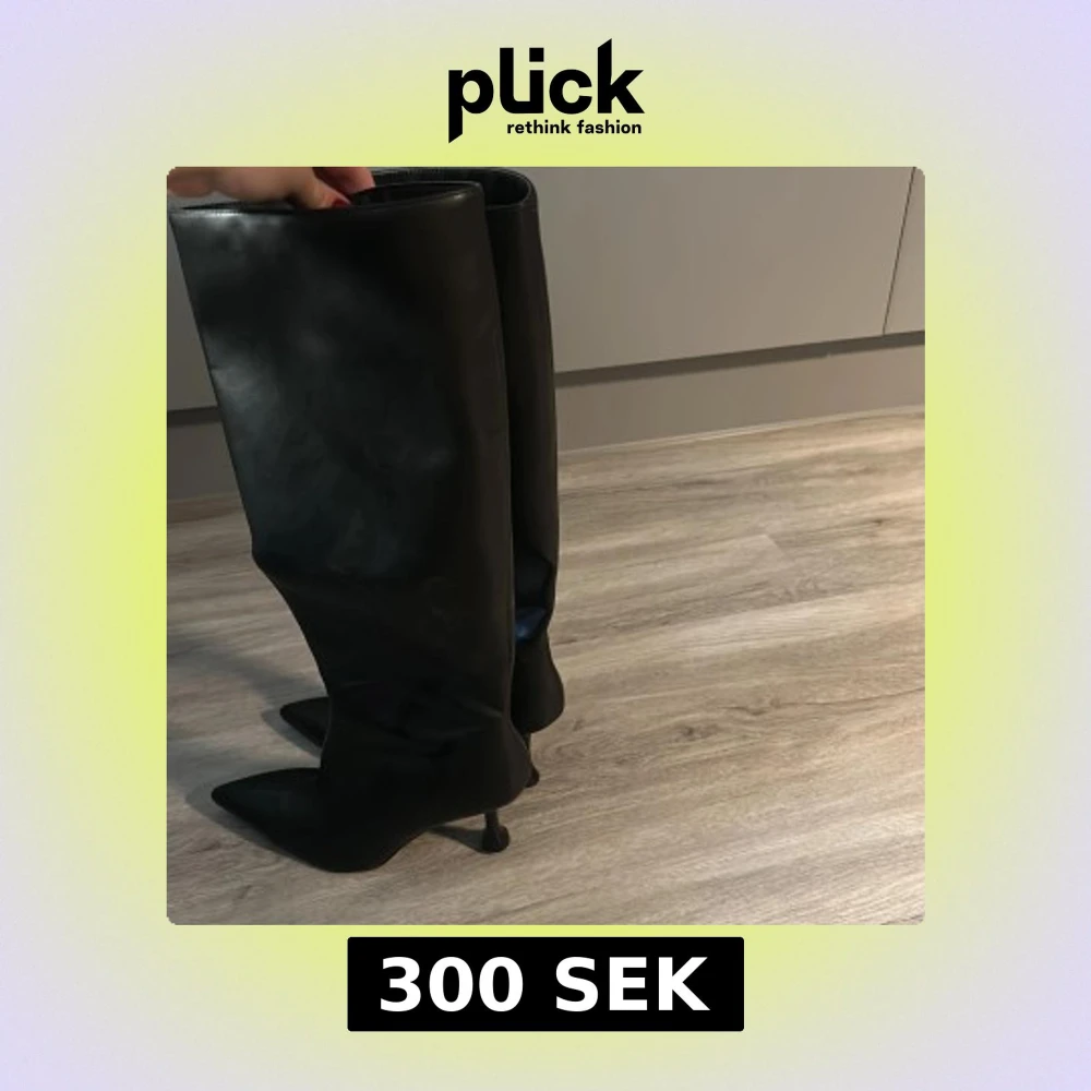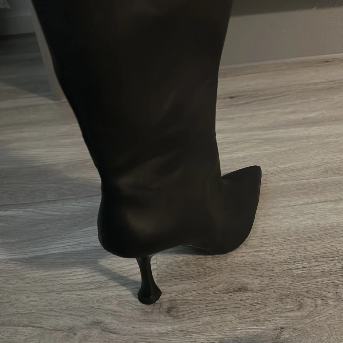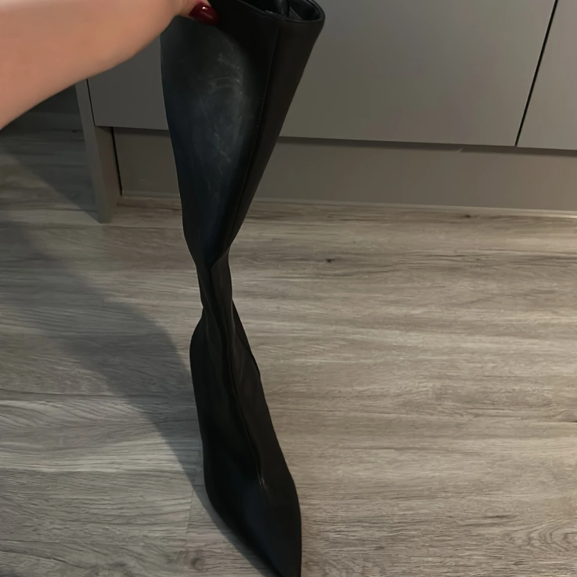 Säljer ett par svarta höga stövlar i skinn med spetsig tå och smal hög klack. Strl 41 men pga den spetsiga tån passar den mindre fötter också.