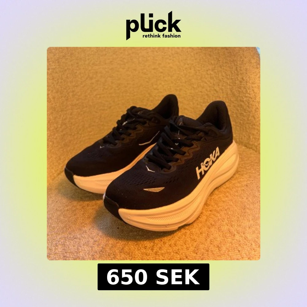 Säljer ett par svarta Hoka Bondi 9 sneakers med vit tjock sula och snörning. Skorna har rund tå och är tillverkade i syntetmaterial med mesh-överdel för extra ventilation. Perfekta för dig som gillar komfort och stil när du är ute och rör på dig. (Endast testade hemma)