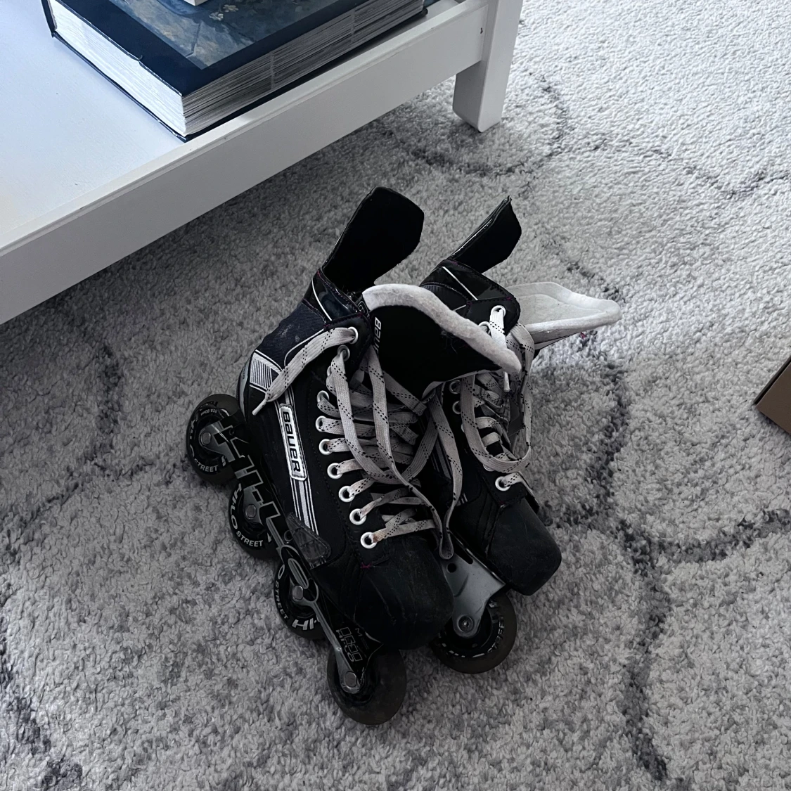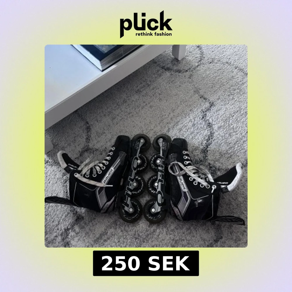 Säljer ett par svarta inlines från Bauer med vita detaljer och snörning. Skorna har robust design, högt skaft och slitstarka hjul från Hi-Lo. Perfekta för dig som vill glida fram på gatan med stil. Inlinesen är inte i jätte bra skick men går fortfarande att andvända.