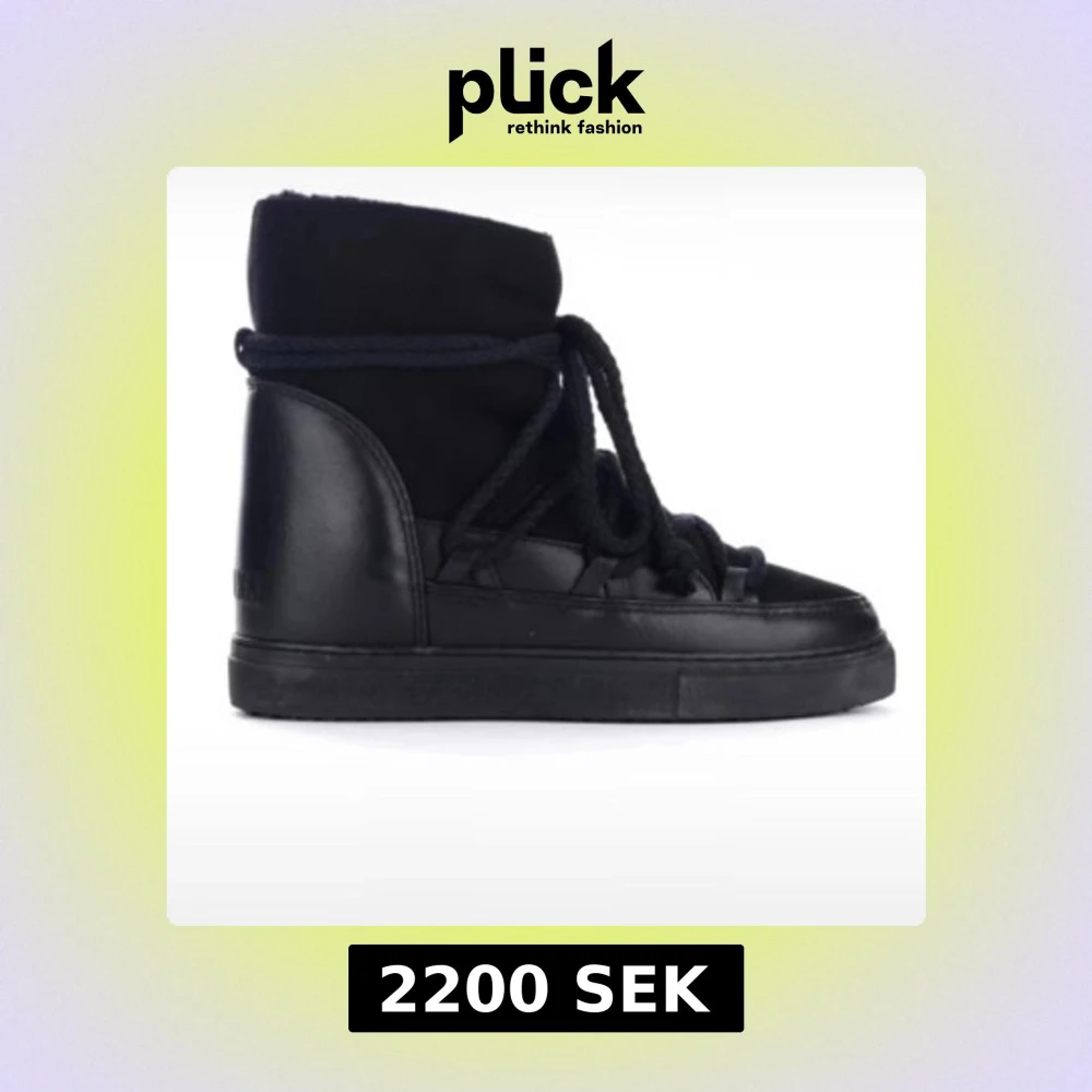 Snygga svarta inuikii med högt skaft och breda snören. Skon har en mix av skinn och syntetmaterial, perfekt för kalla dagar. Den platta sulan och den runda tån ger en cool och urban vibe. Passar dig som vill sticka ut med en unik vinterlook.