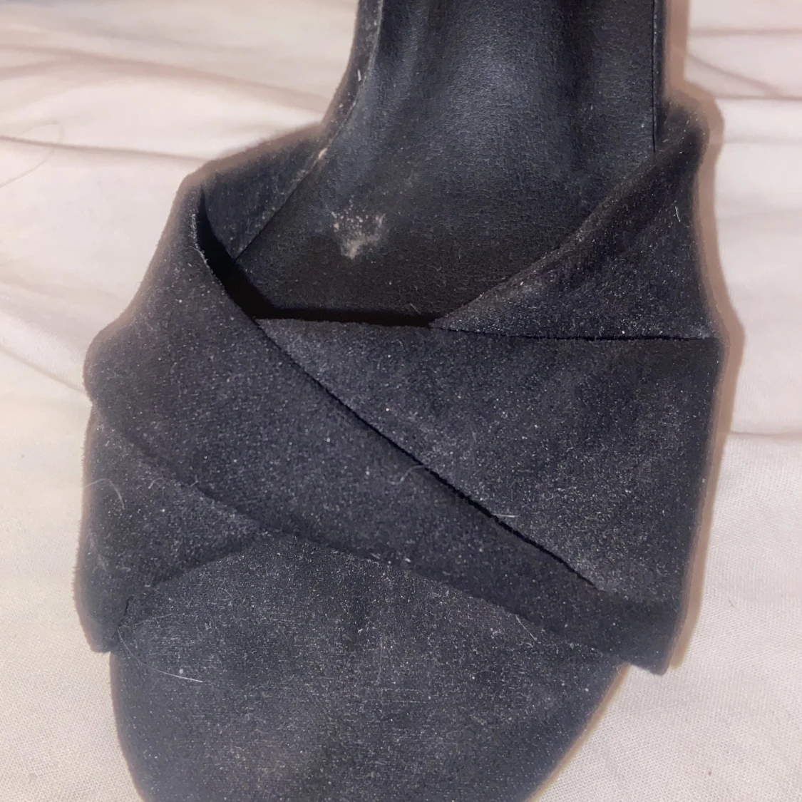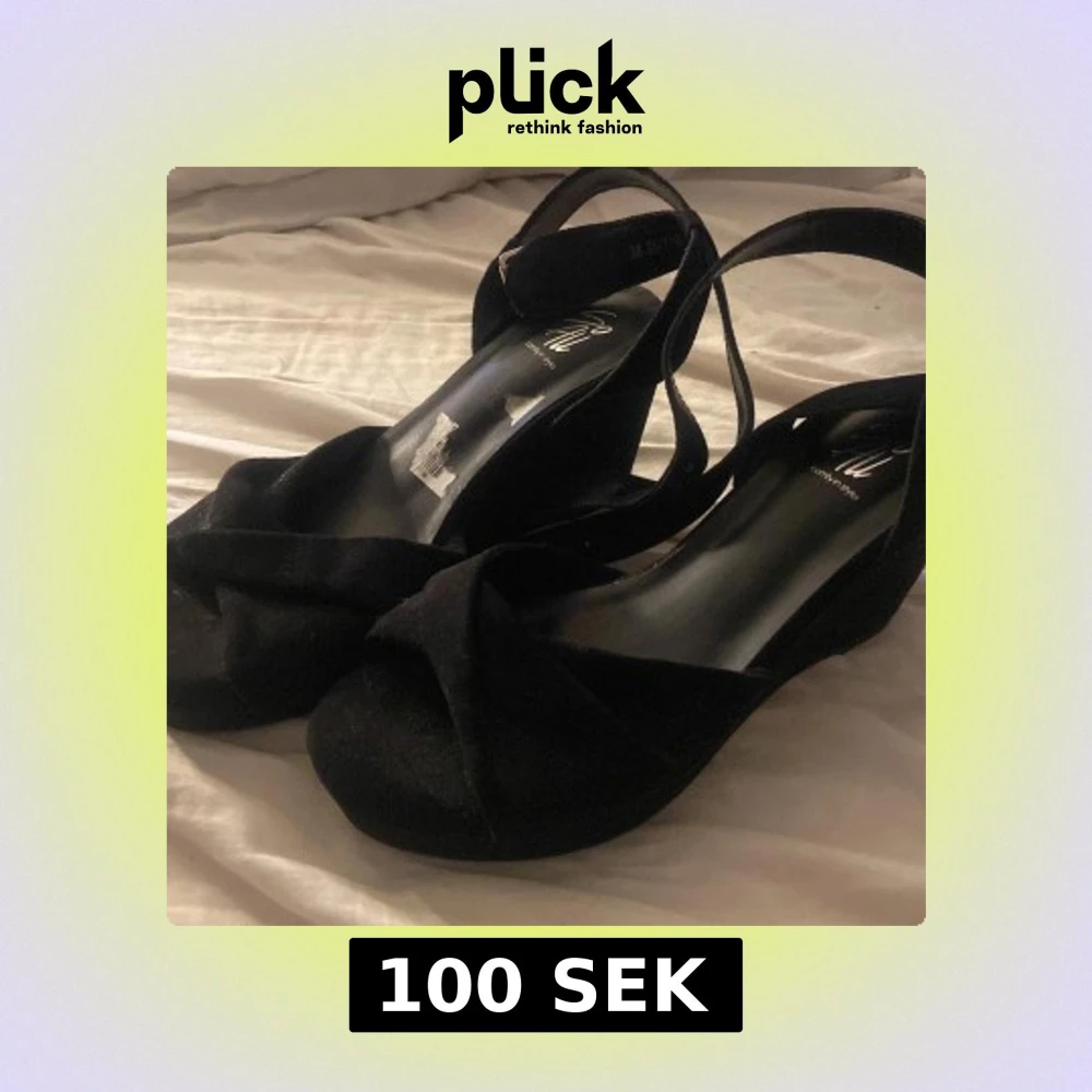 Säljer ett par svarta sandaler med kilklack från H&M. Skorna har breda korslagda remmar över tårna och en justerbar rem runt ankeln. Materialet är mocka-liknande syntet och sulan är platt framtill med hög kilklack. Perfekta för sommarkvällar.