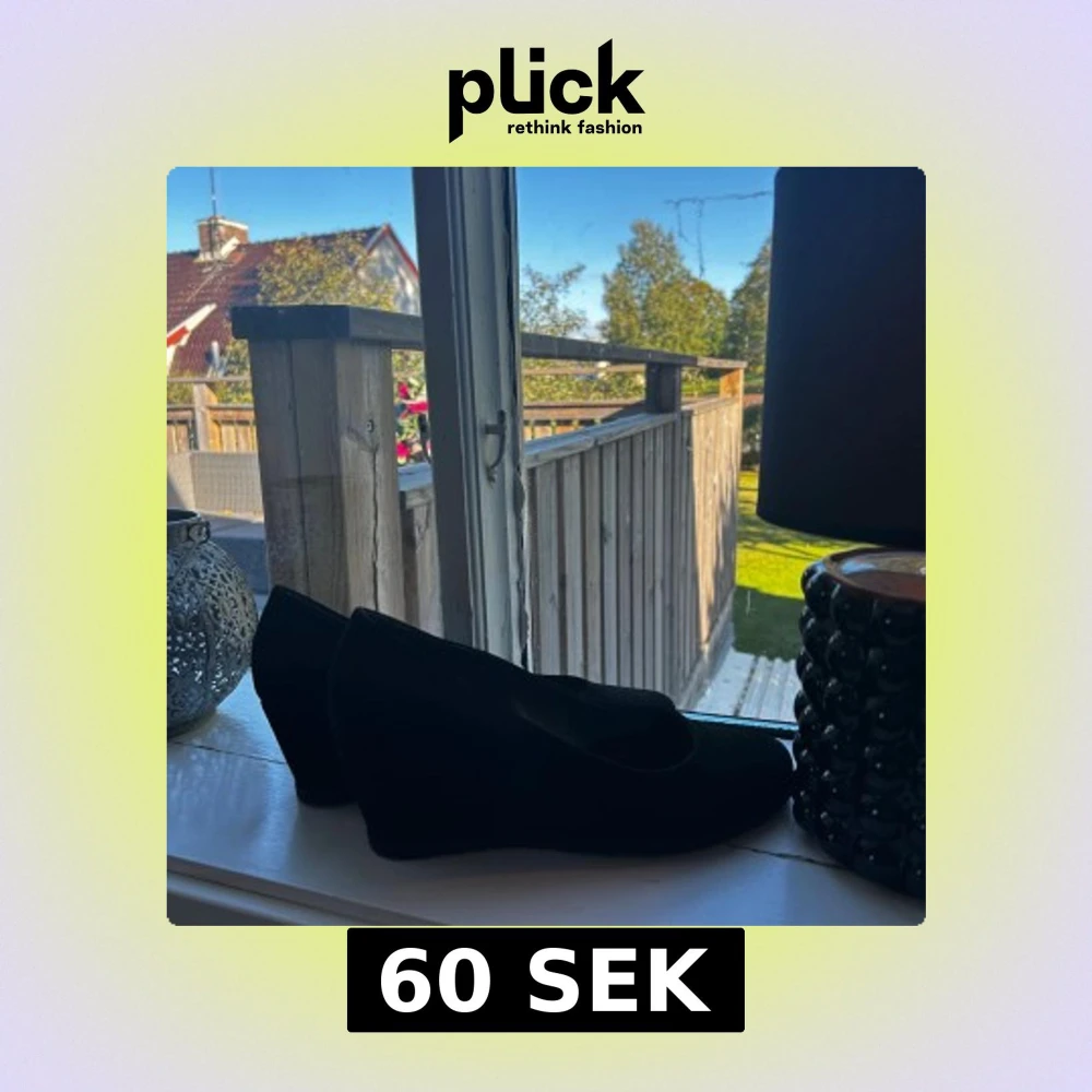 Säljer ett par svarta pumps med kilklack och rund tå. Skorna har en klassisk och stilren design, perfekta för dig som vill ha lite höjd men ändå bekvämt. Materialet är mocka. Passar till många olika outfits.