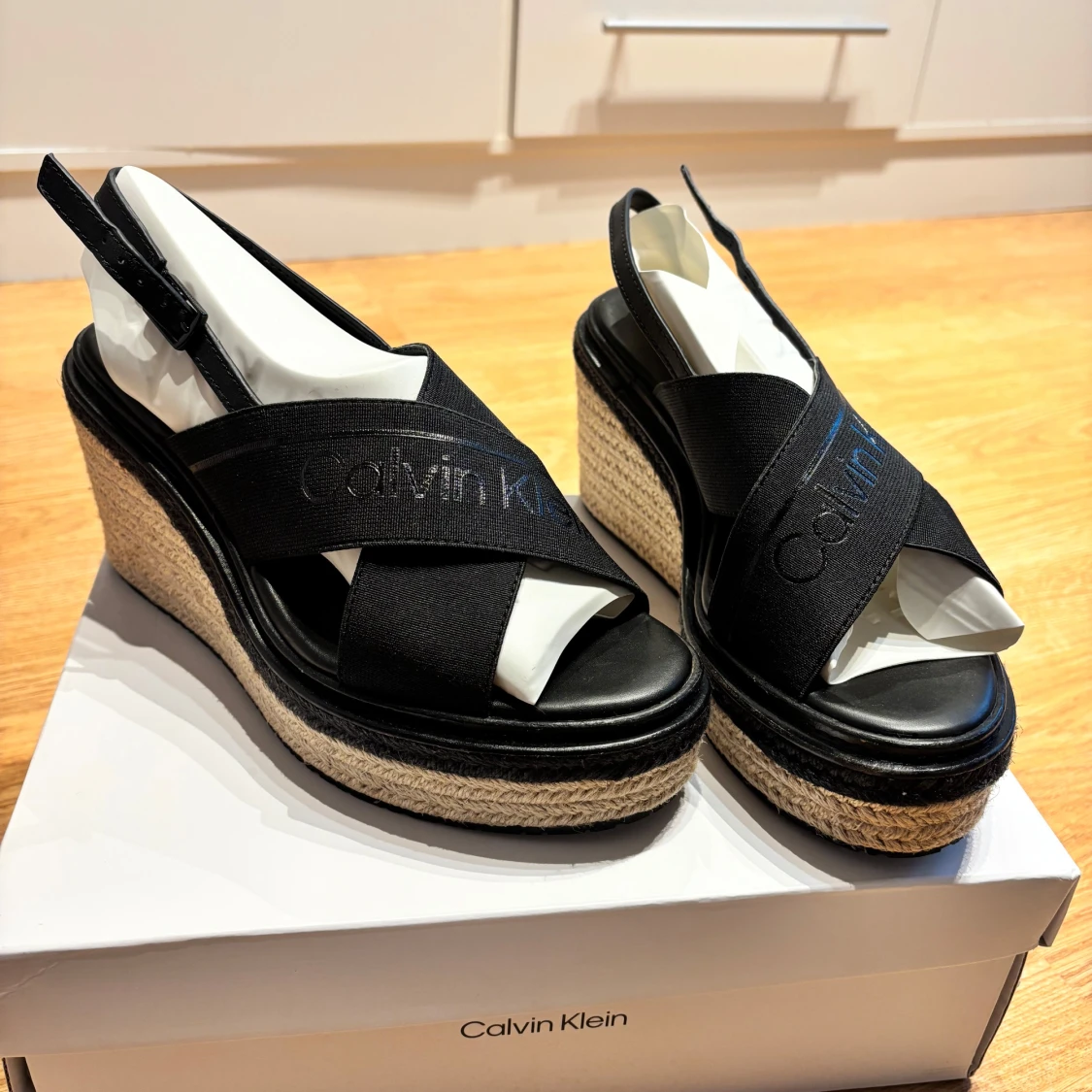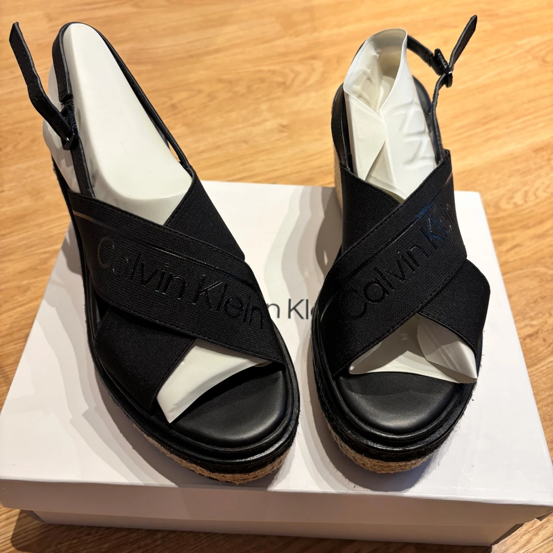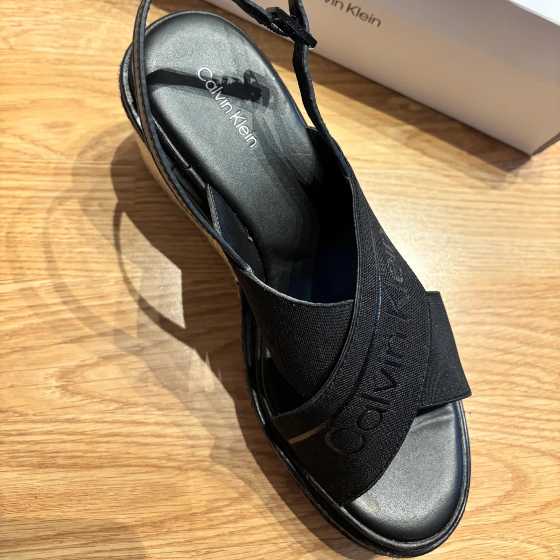 Snygga svarta kilklackar från Calvin Klein med öppen tå och elastiska band. Bara använda en gång. Nypris 1799 kr.