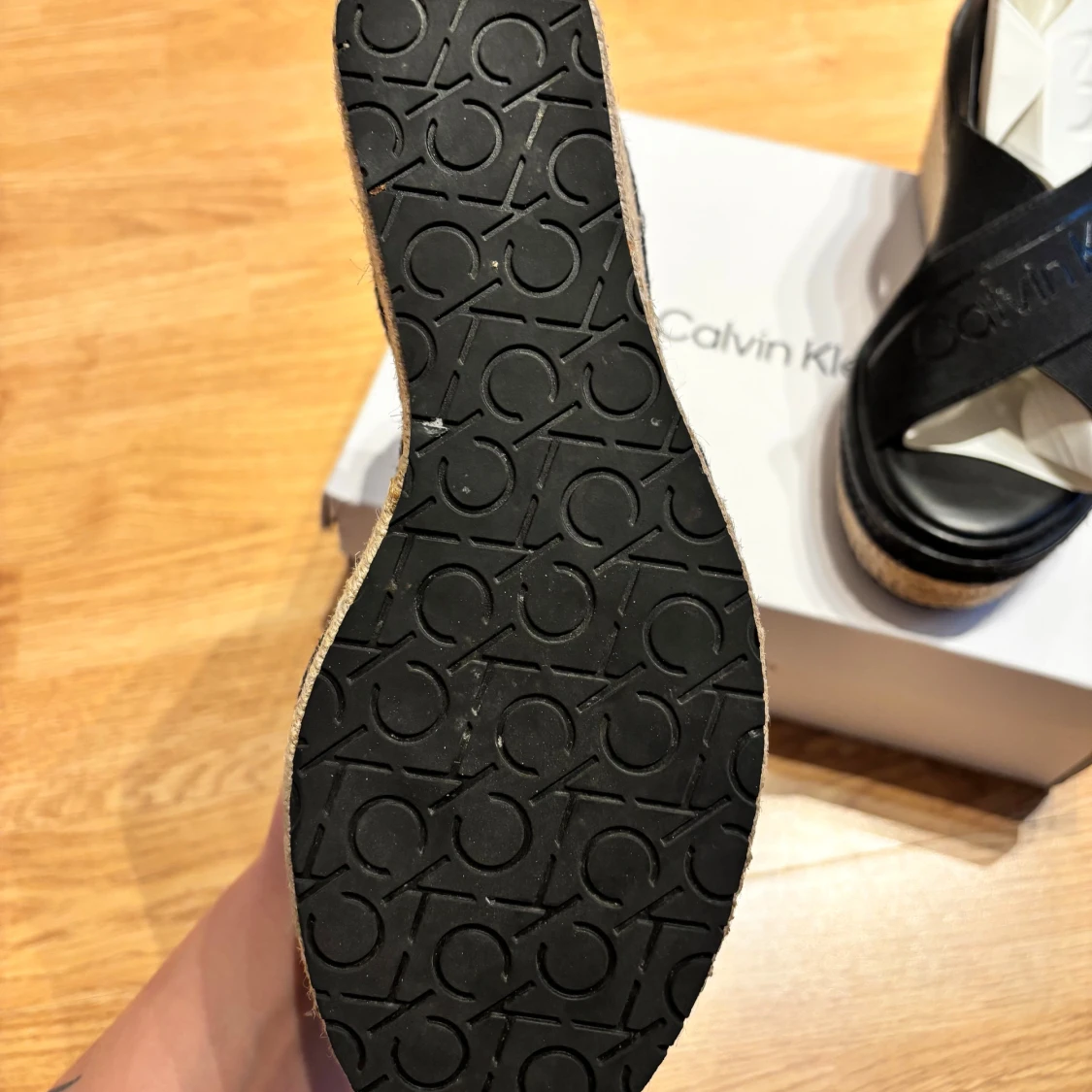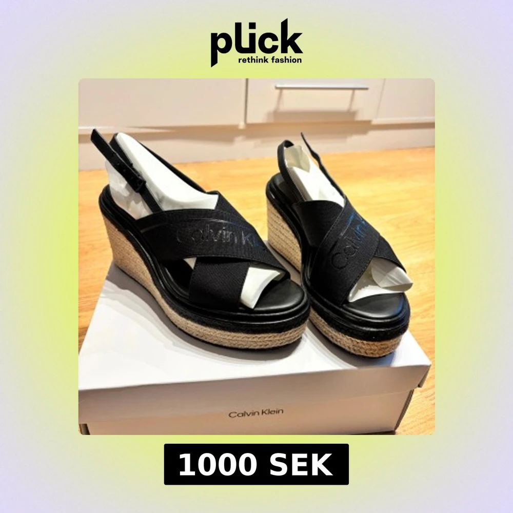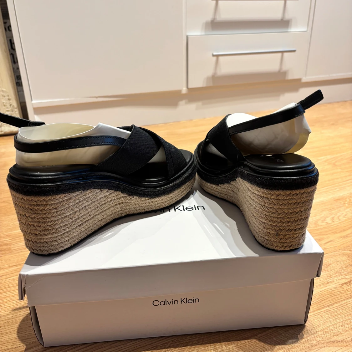 Snygga svarta kilklackar från Calvin Klein med öppen tå och elastiska band. Bara använda en gång. Nypris 1799 kr.