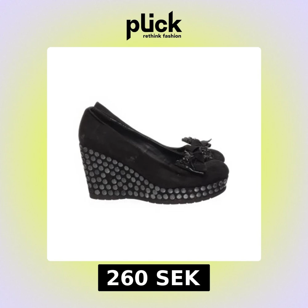 Snygga svarta kilklackar med dekorativa rosetter och nitar på sulan.Några av nitarna är borta och dom är ganska slitna men de funkar fof. Skorna har en hög kilklack och en rundad tå.