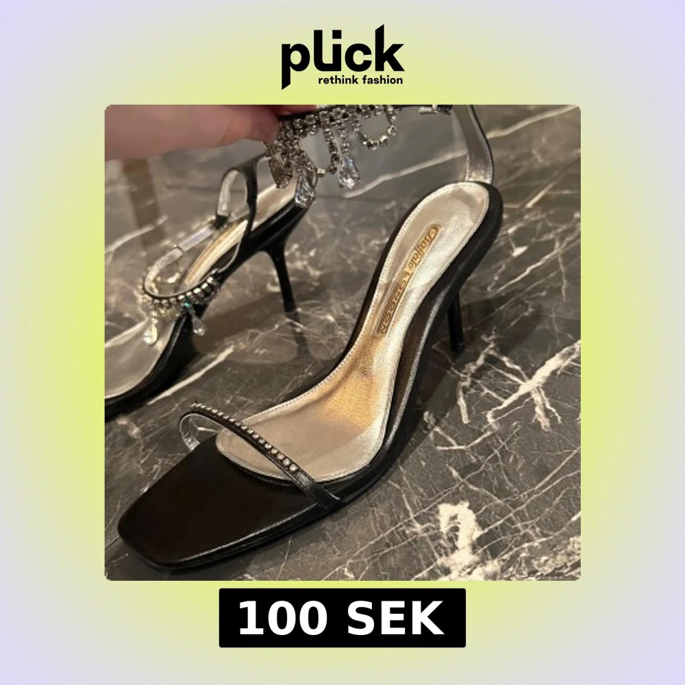 Säljer ett par svarta sandaler med klack från Buffalo London. Skorna har en fyrkantig tå, silverfärgad innersula och smala remmar dekorerade med strass. Runt ankeln sitter en glittrig kedja med hängande kristaller som ger extra bling.